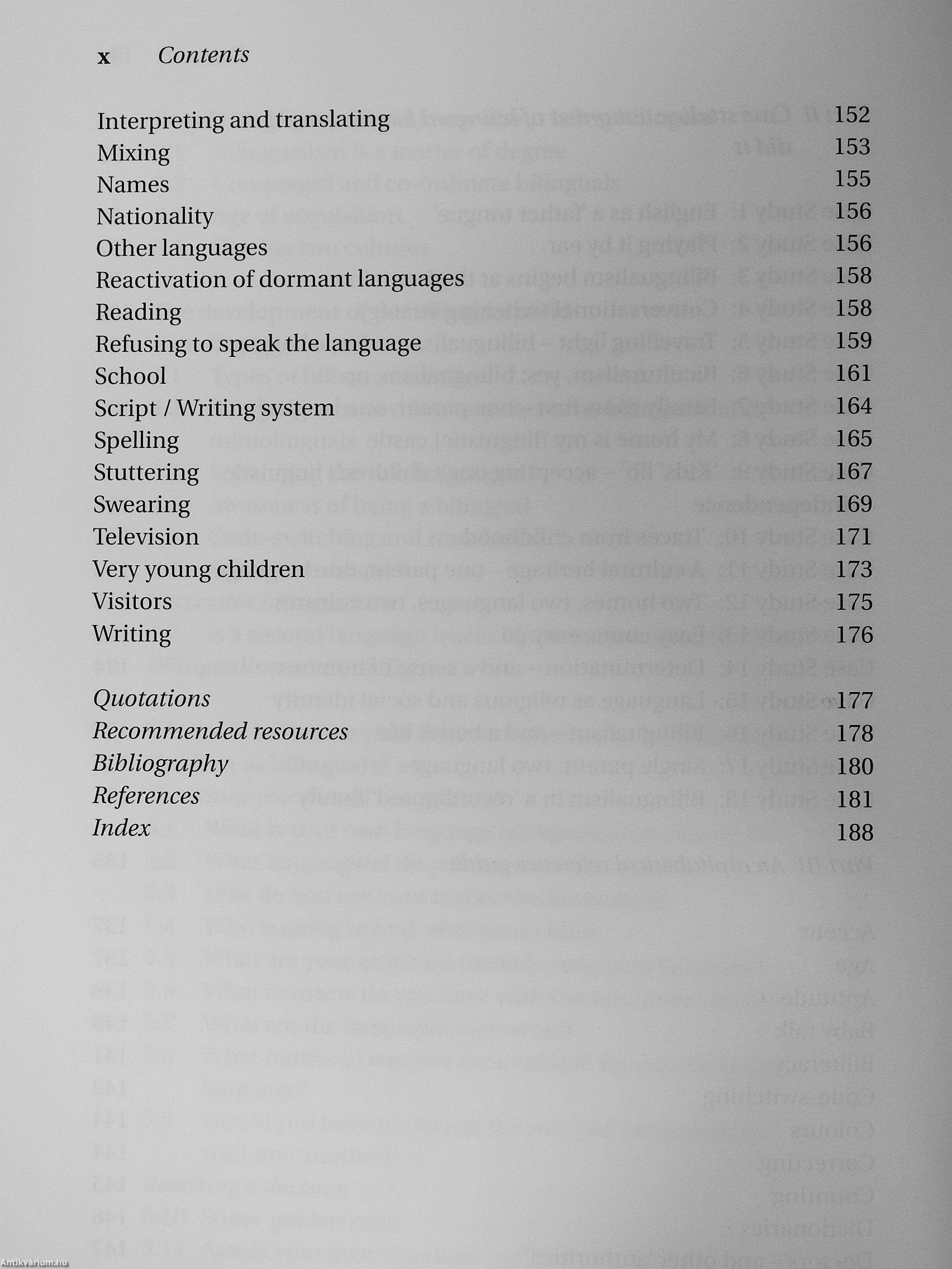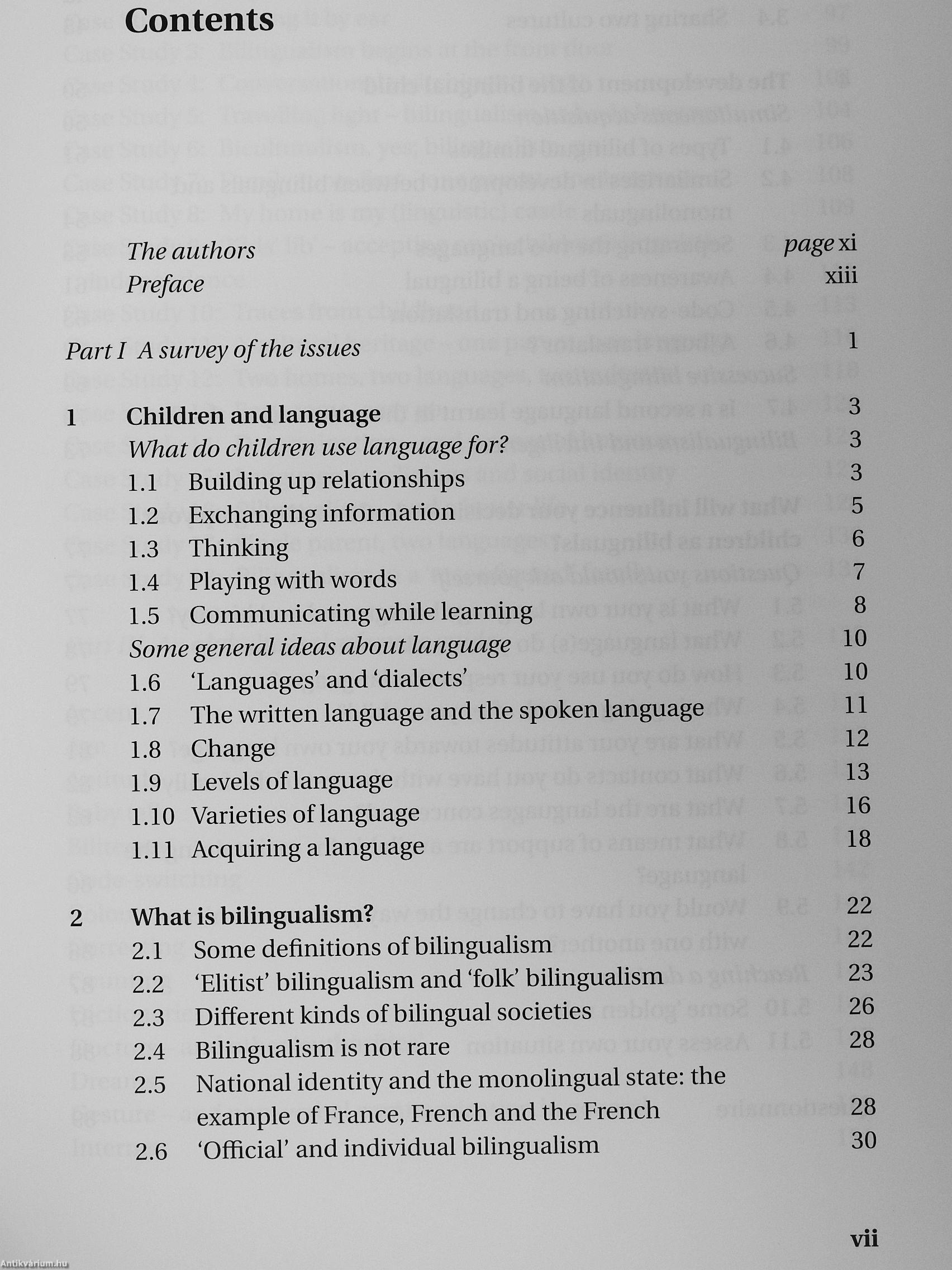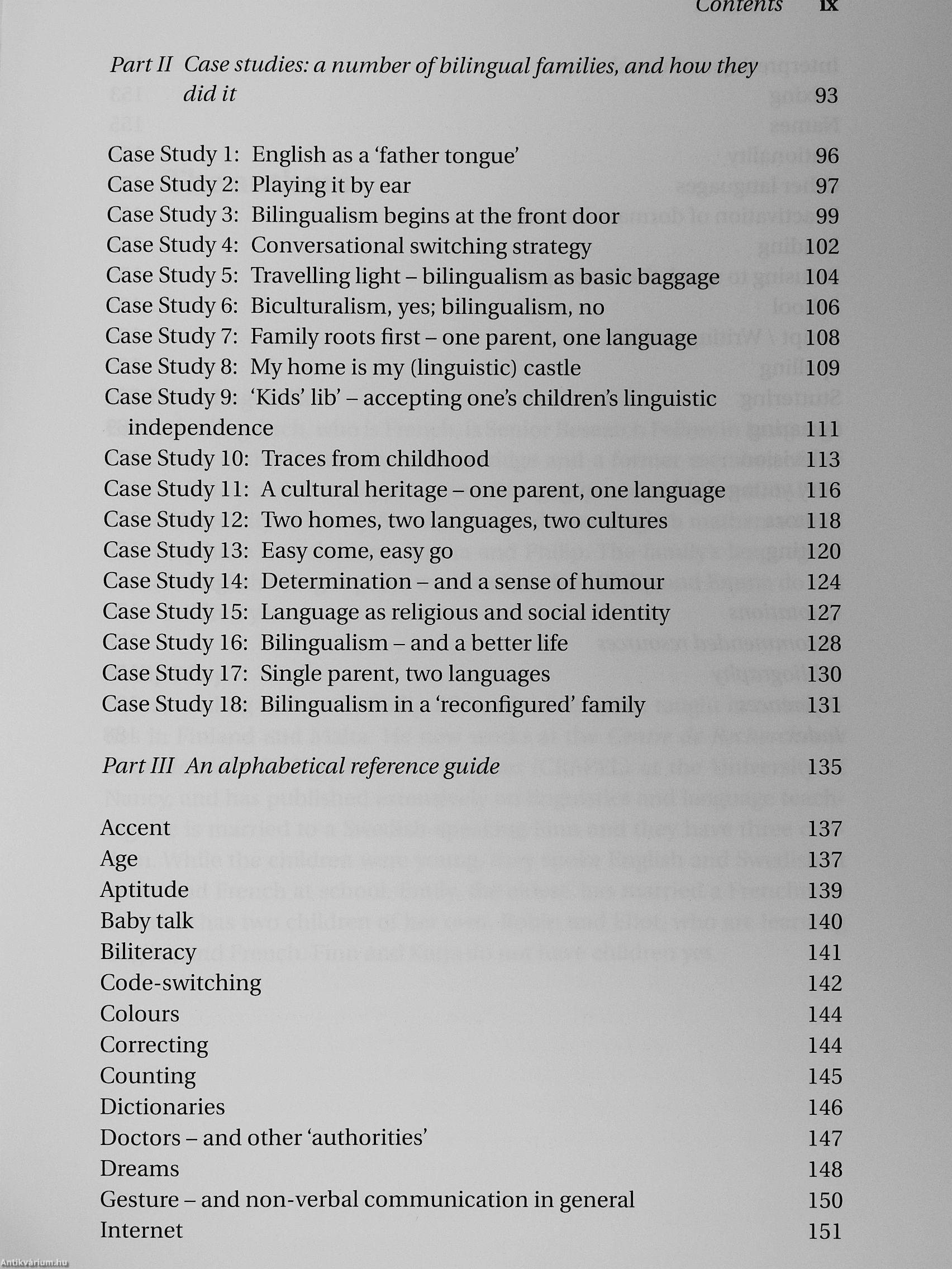 The book continues to be divided into three main parts. In the - ' first, the authors help parents identify the factors that will influence their decision to bring up their children as bilinguals.The second part consists of case studies of bilingual families, yvhich illustrate a wide range of different'solutions'.The third part is an alphabetical reference guide providing answers to the most frequently asked questions about bilingualism. _ \