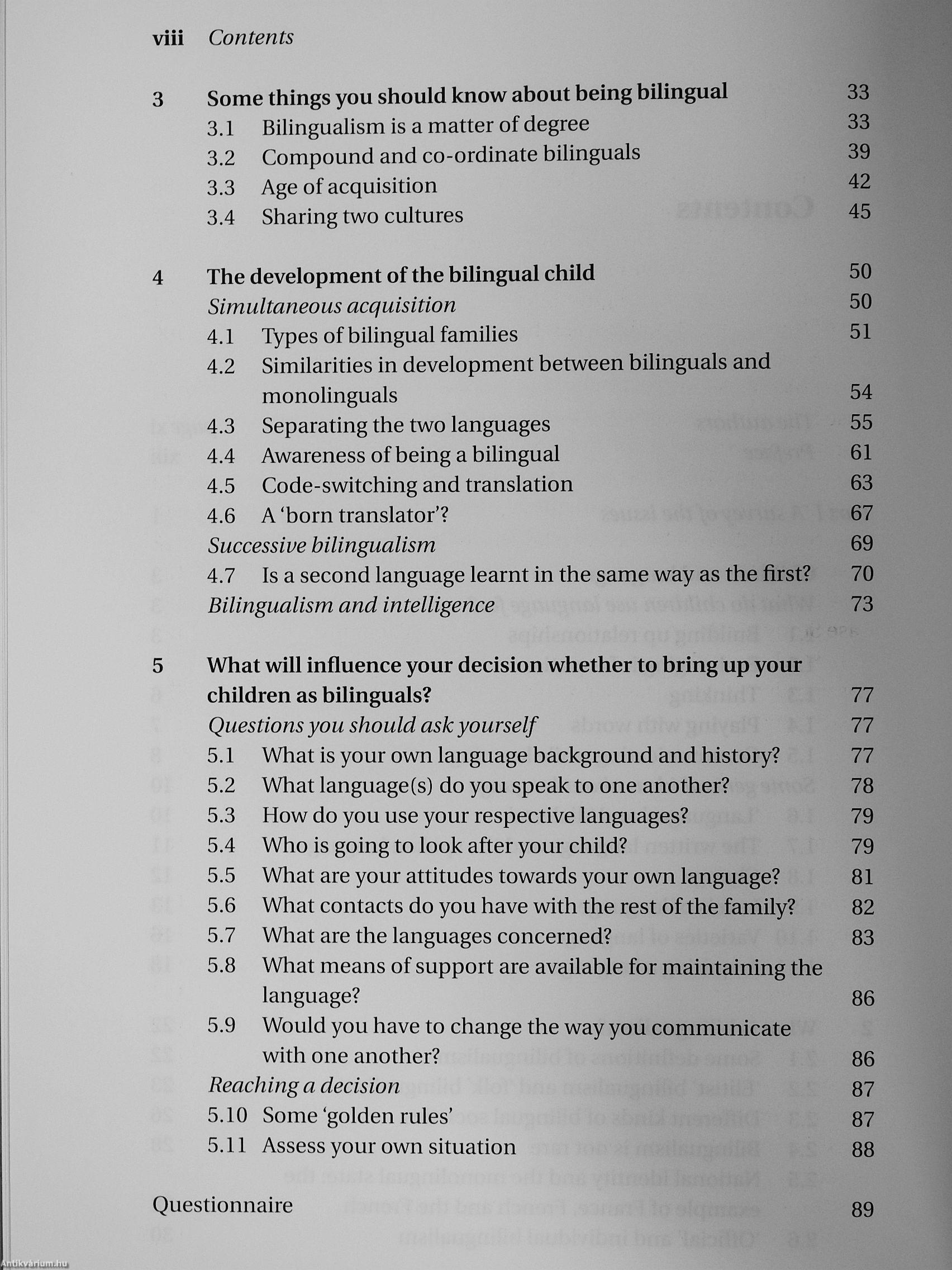 The book continues to be divided into three main parts. In the - ' first, the authors help parents identify the factors that will influence their decision to bring up their children as bilinguals.The second part consists of case studies of bilingual families, yvhich illustrate a wide range of different'solutions'.The third part is... Tovább