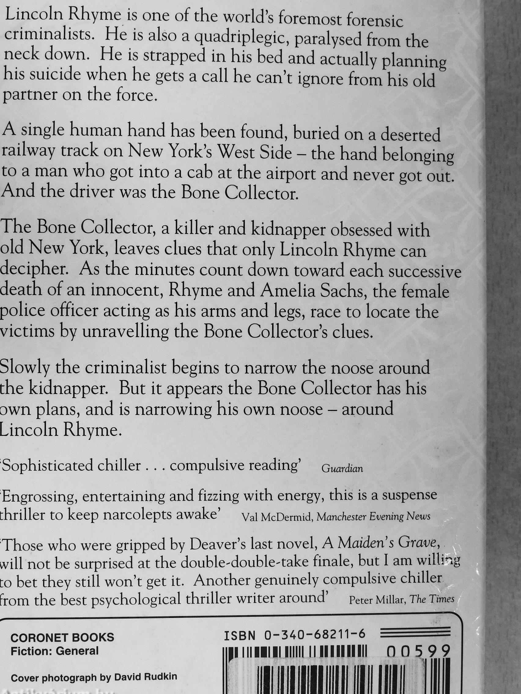 Lincoln Rhyme is one of the world's foremost forensic criminalists. He is also a quadriplegic, paralysed from the neck down. He is strapped in his bed and actually planning his suicide when he gets a call he can't ignore from his old partner on the force.