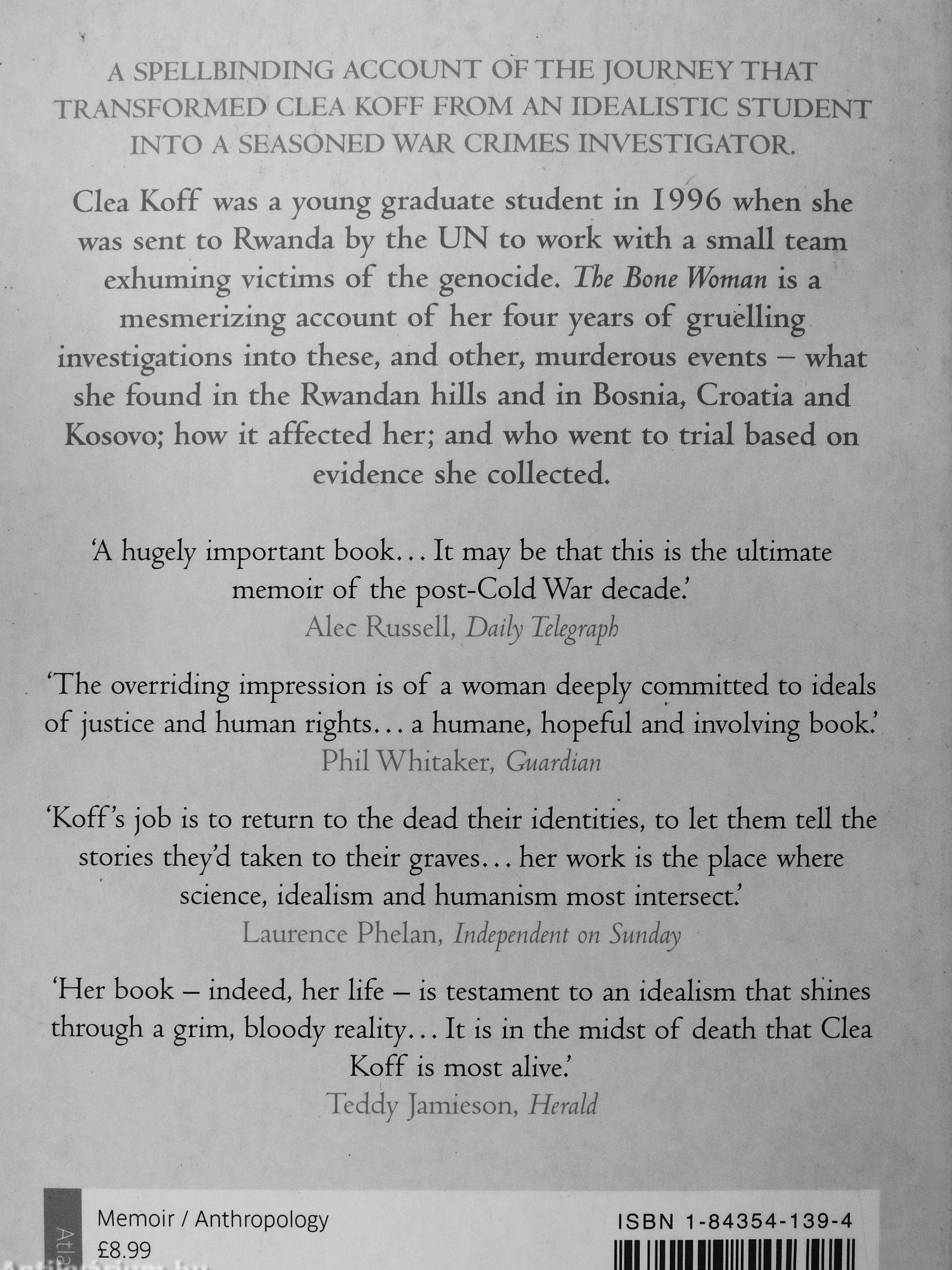 Clea Koff was a young graduate student in 1996 when she was sent to Rwanda by the UN to work with a small team exhuming victims of the genocide. The Bone Woman is a mesmerizing account of her four years of gruelling investigations into these, and other, murderous events — what she found in the Rwandan hills and in Bosnia, Croatia and Kosovo; how it affected her; and who went to trial based on evidence she collected.