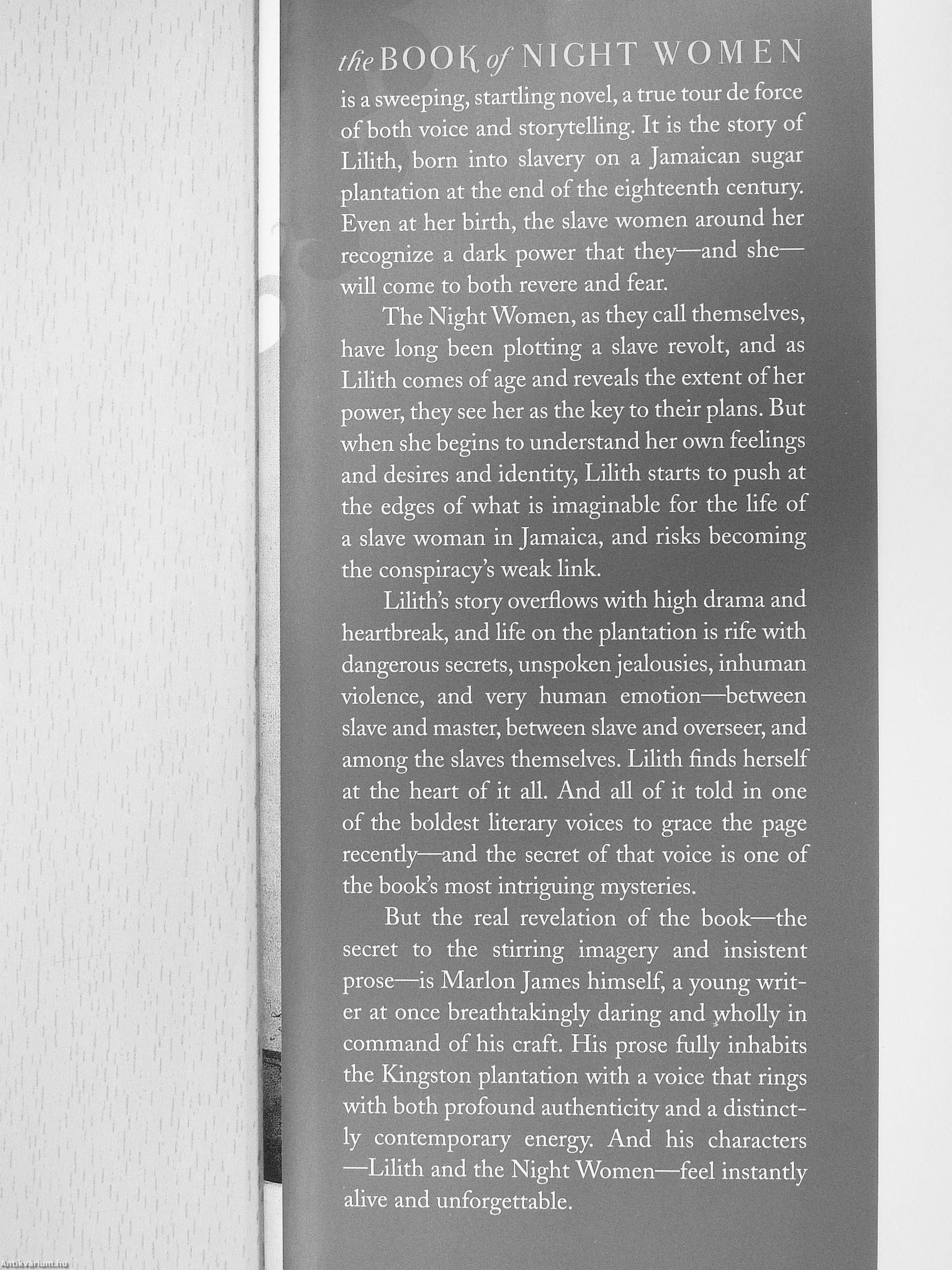 But the real revelation of the book—the secret to the stirring imagery and insistent prose—is Marlon James himself, a young writer at once breathtakingly daring and yvholly in command of his craft. His prose fully inhabits the Kingston plantation with a voice that rings with both profound authenticity and a distinctly contemporary energy. And his characters —Lilith and the Night Women—feel instantly alive and unforgettable.