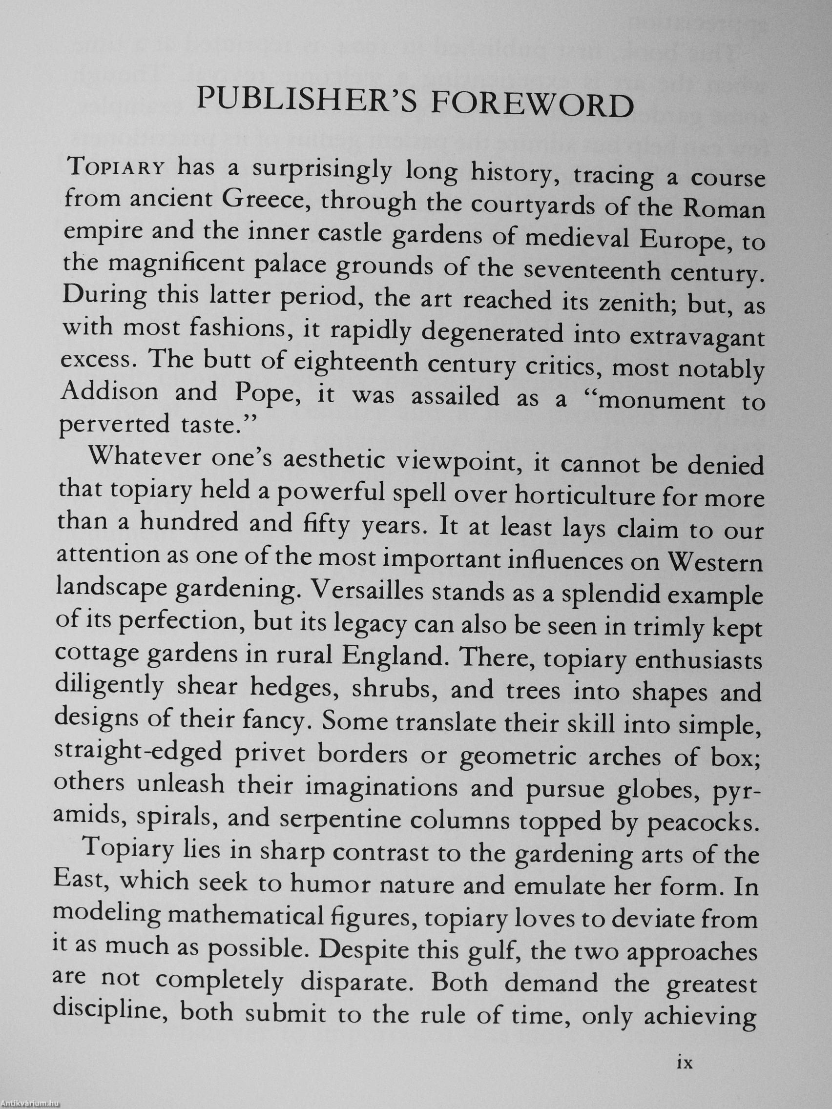 Curtis traces the long history of topiary from its early origins in ancient Greece. As Homer's description (rendered by Pope) has it: