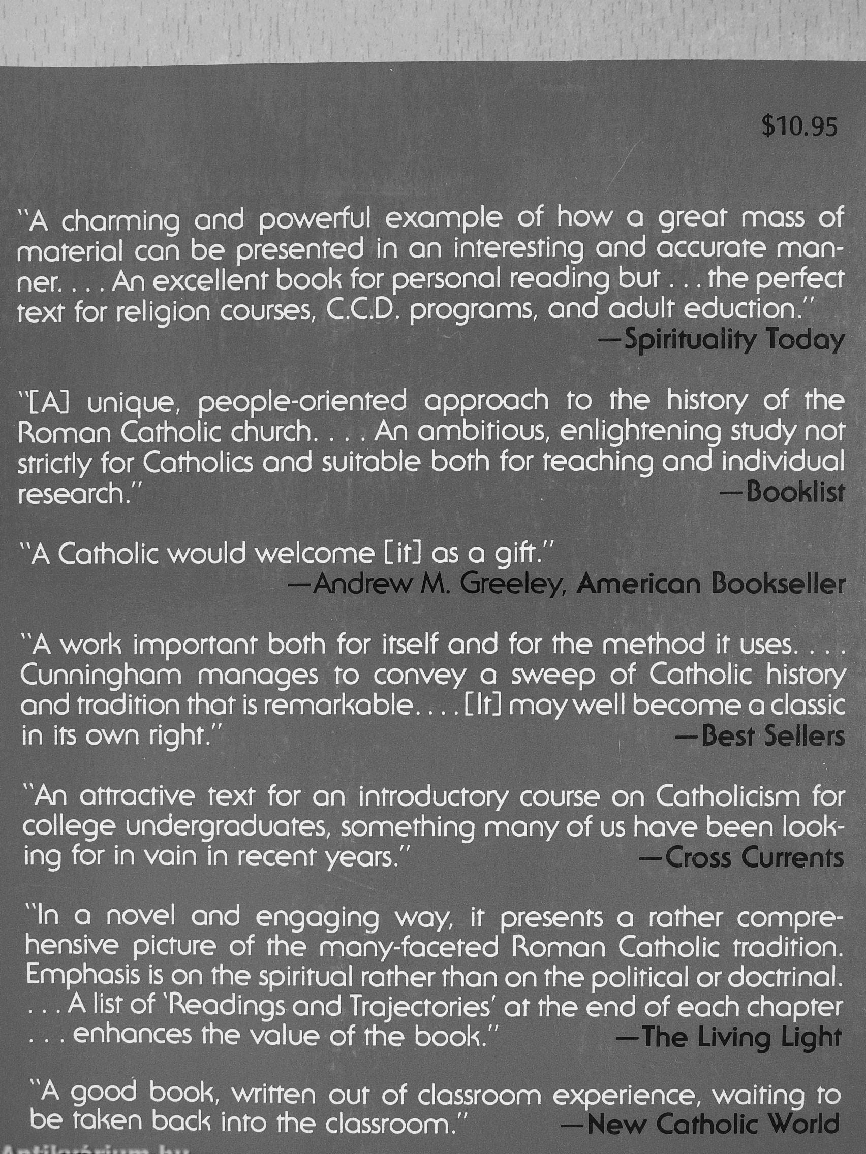 "A work important both for itself and for the method it uses. . Cunningham manages to convey a sweep of Catholic history and tradition that is remarkable____[It] may