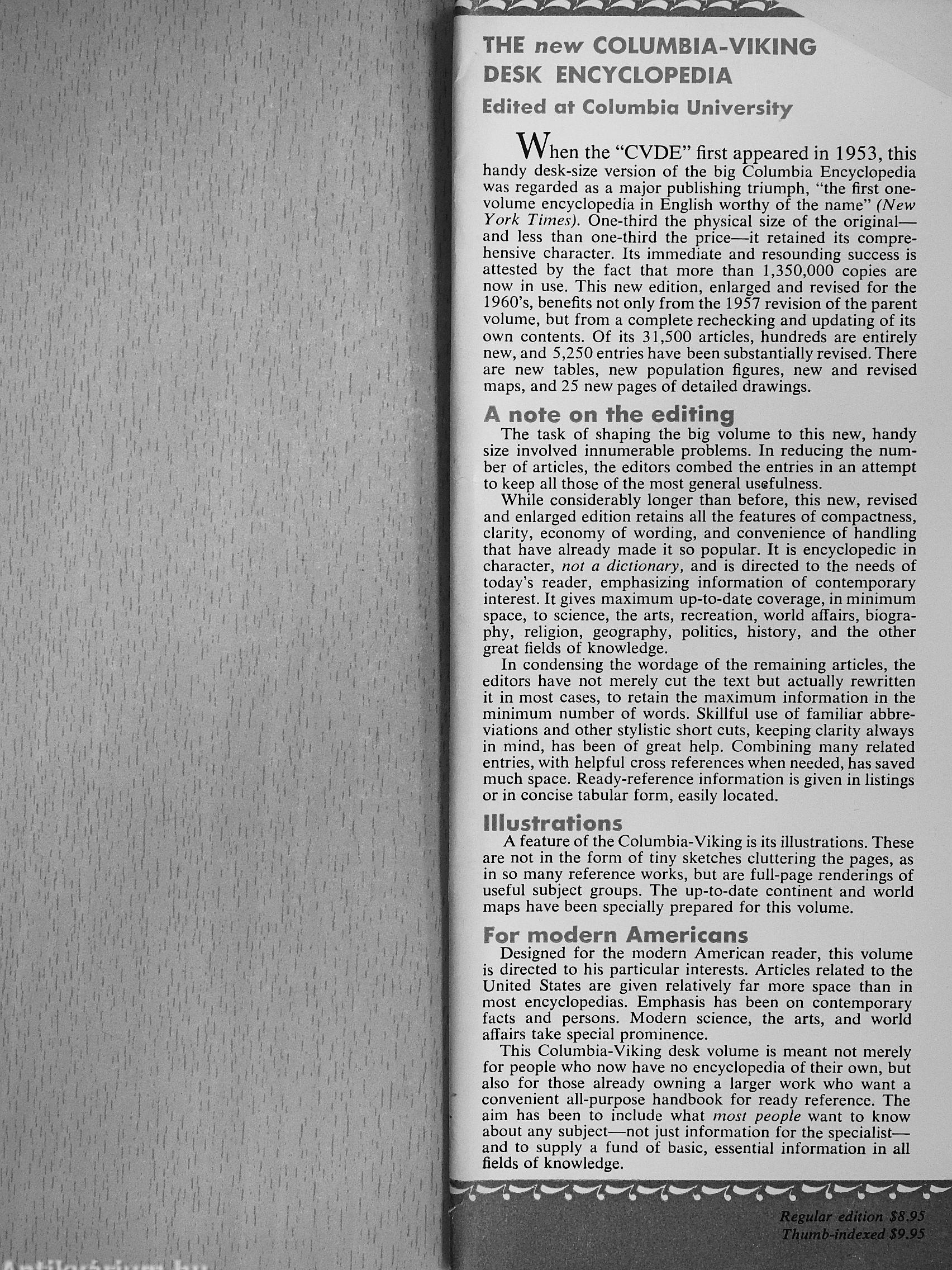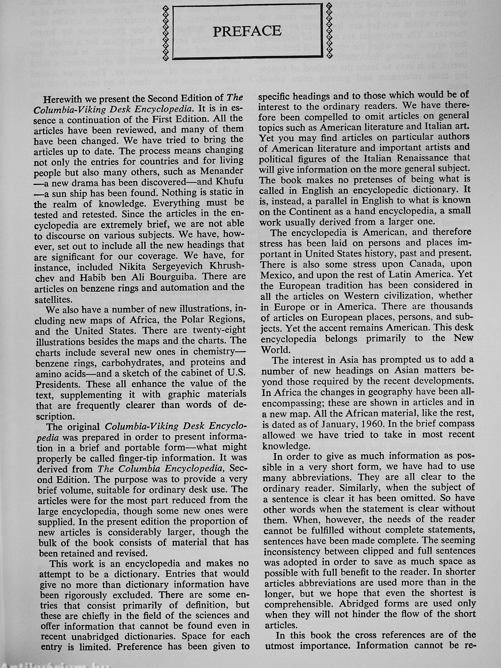 This Columbia-Viking desk volume is meant not merely for people who now have no encyclopedia of their own, but also for those already owning a larger work who want a convenient all-purpose handbook for ready reference. The aim has been to include what most people want to know about any subject—not just information for the specialist— and to supply a fund of basic, essential information in all fields of knowledge.