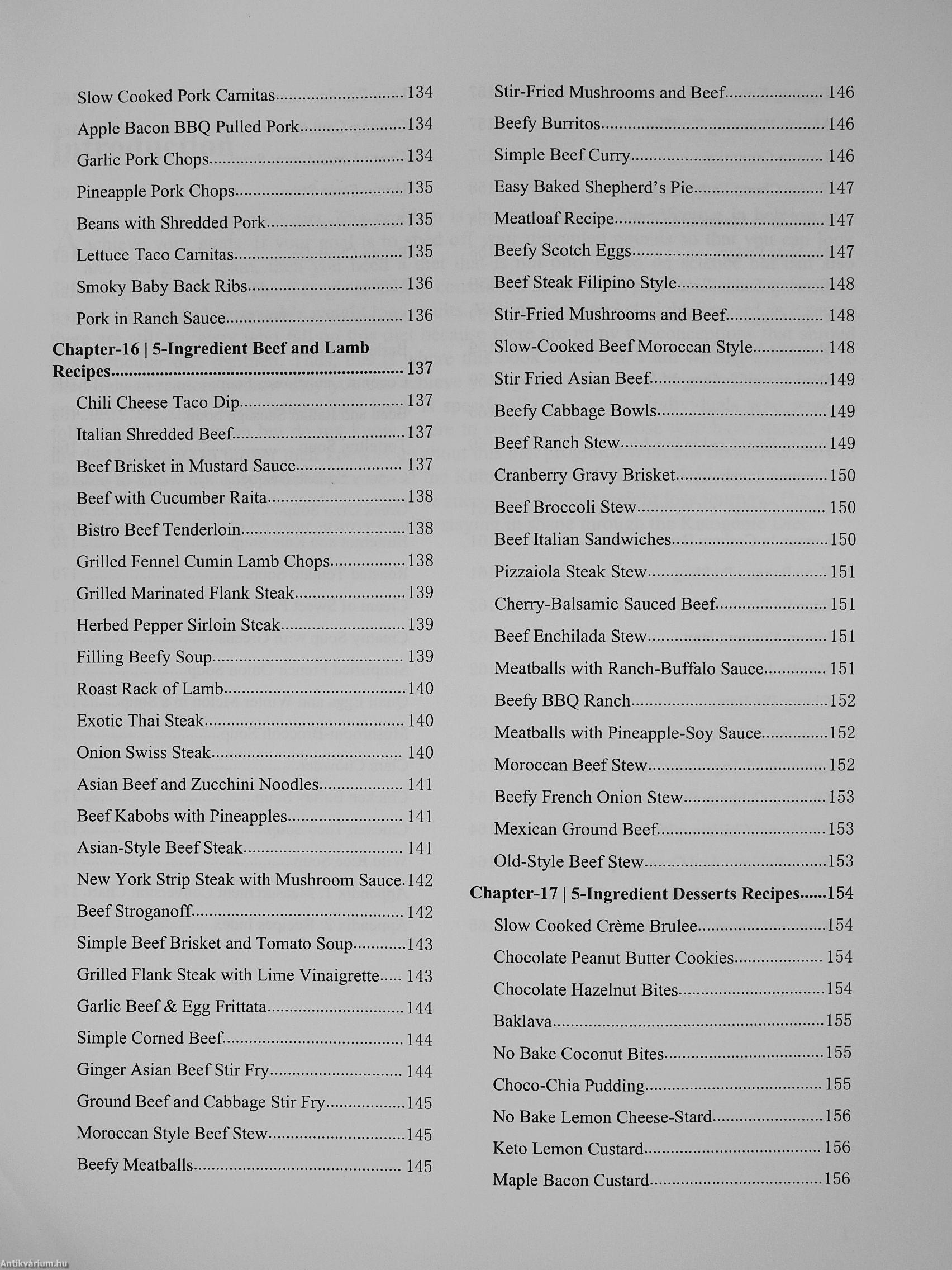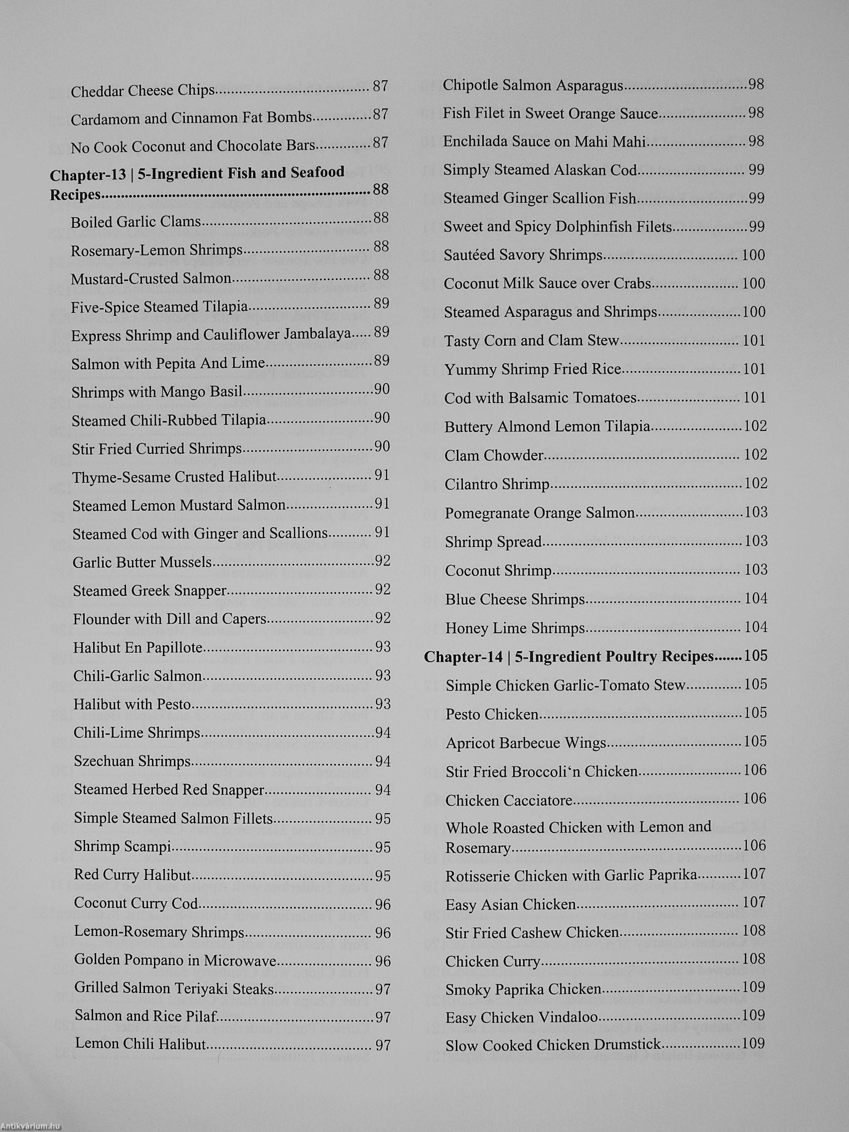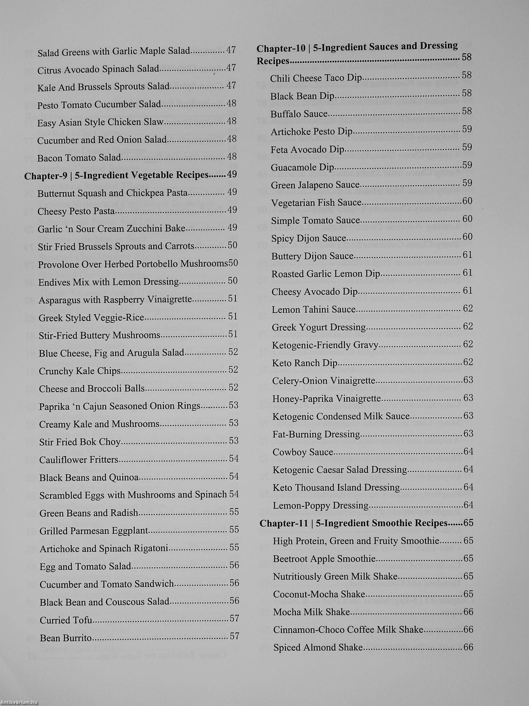 Eggs & Dairy recipes, Appetizer recipes, Vegan recipes. Salad, Vegetable recipes. Sauces and Dressing, Smoothies, Side dishes and Snack recipes. Fish & Seafood, Poultry Recipes, Pork recipes, Beef & Lamb, Desserts and Soup. This complete 5-ingredient recipe book will help you whip up delectable meals even with limited ingredients. The thing is that you don't need sophisticated ingredients to create delicious meals. All you need are few ingredients and creativity to create delicious meals almost worthy for an excellent dining experience.