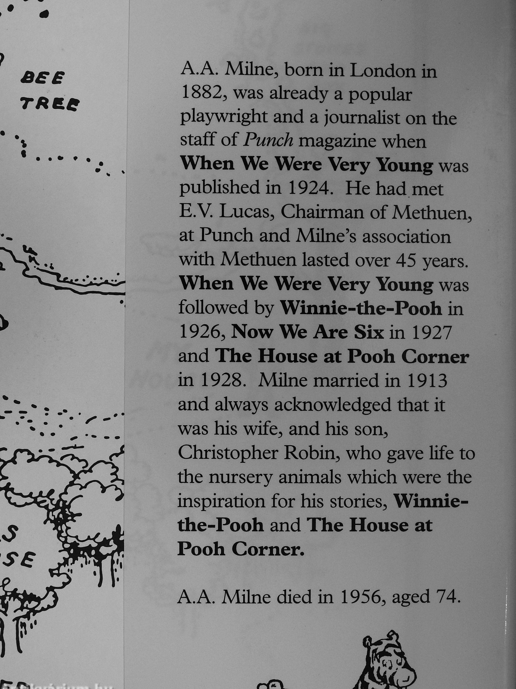 A. A. Milne, born in London in 1882, was already a popular playwright and a journalist on the staff of Punch magazine when When We Were Very Young was published in 1924. He had met E.V. Lucas, Chairman of Methuen, at Punch and Milne's association with Methuen lasted over 45 years. When We Were Very Young was followed by Winnie-the-Pooh in 1926, Now We Are Six in 1927 and The House at Pooh Corner in 1928. Milne married in 1913 and always acknowledged that it was his wife, and his son, Christopher Robin, who gave life to the nursery animals which were the inspiration for his stories, Wmnie-the-Pooh and The House at Pooh Corner.