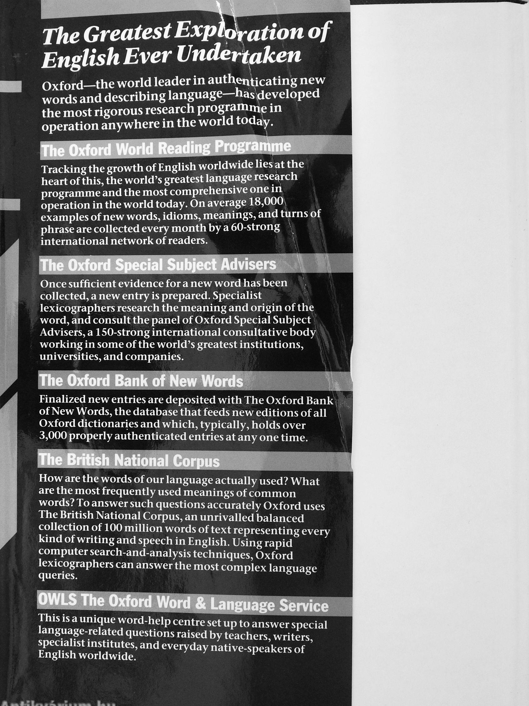How are the words of our language actually used? What are the most frequently used meanings of common words? To answer such questions accurately Oxford uses The British National Corpus, an unrivalled balanced collection of 100 million words of text representing every kind of writing and speech in English. Using rapid computer search-and-analysis techniques, Oxford ^®*^»cographers can answer the most complex language