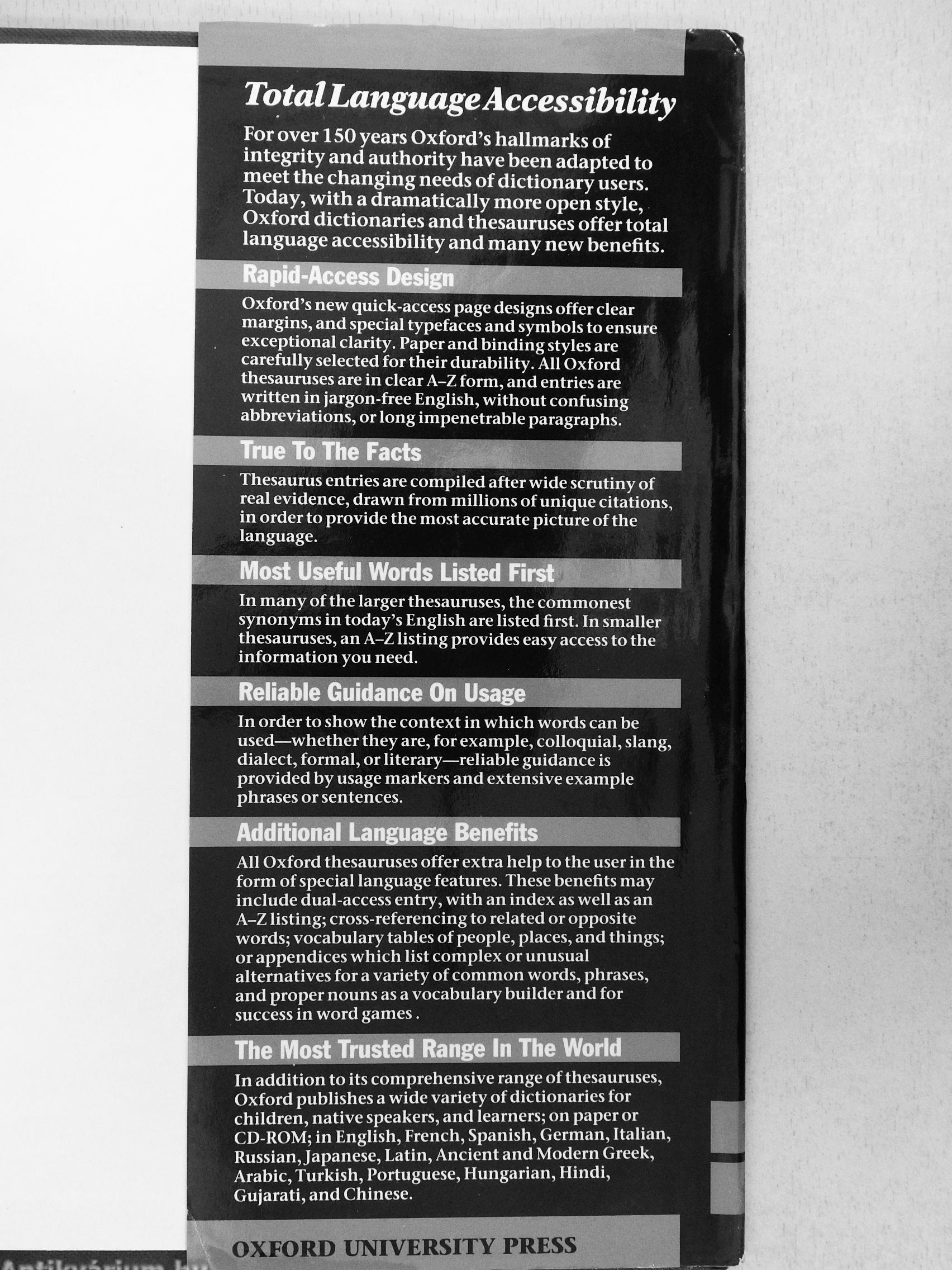 Oxford's new quick-access page designs offer clear margins, and special typefaces and symbols to ensure exceptional clarity. Paper and binding styles are carefully selected for their durability. All Oxford thesauruses are in clear A-Z form, and entries are written in jargon-free English, without confusing abbreviations, or long impenetrable paragraphs.