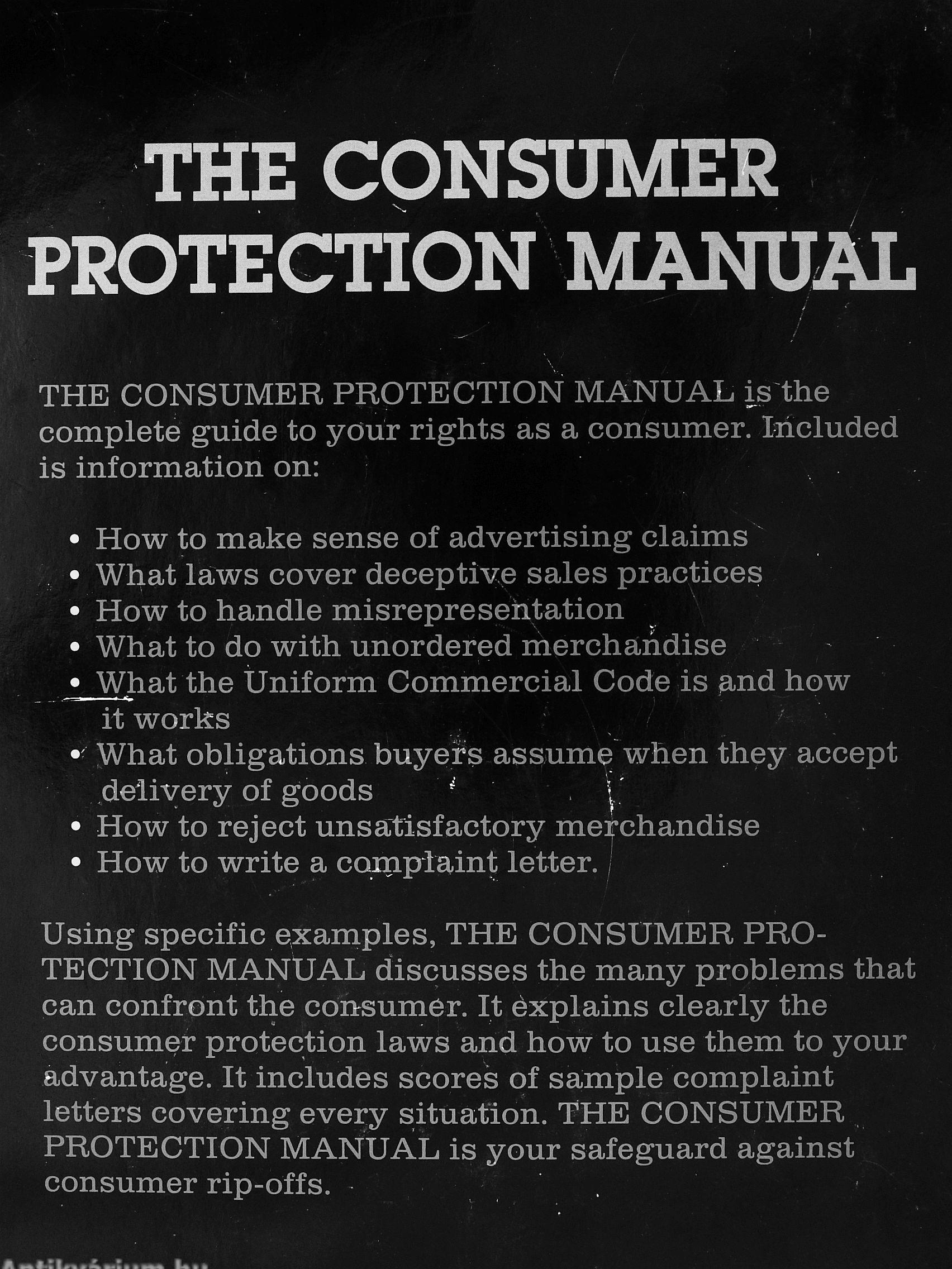 Using specific examples, THE CONSUMER PROTECTION MANUAL discusses the many problems that can confront the consumer. It explains clearly the consumer protection laws and how to use them to your advantage. It includes scores of sample complaint letters covering every situation. THE CONSUMER PROTECTION MANUAL is your safeguard against consumer rip-offs.