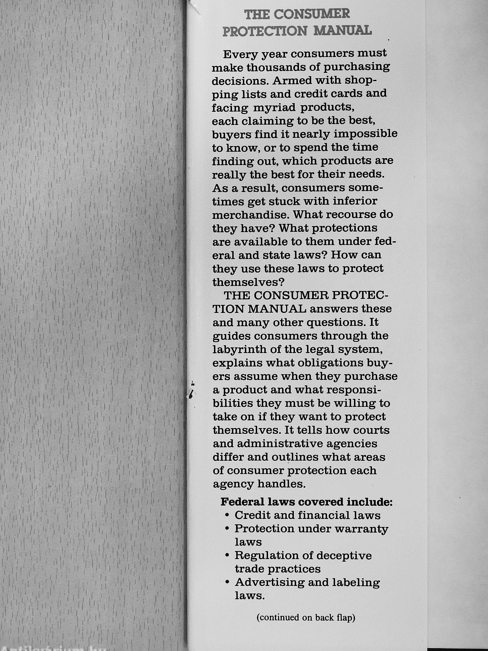 THE CONSUMER PROTECTION MANUAL answers these and many other questions. It guides consumers through the labyrinth of the legal system, explains what obligations buyers assume when they purchase a product and what responsibilities they must be willing to take on if they want to protect themselves. It tells how courts and administrative agencies differ and outlines what areas of consumer protection each agency handles.