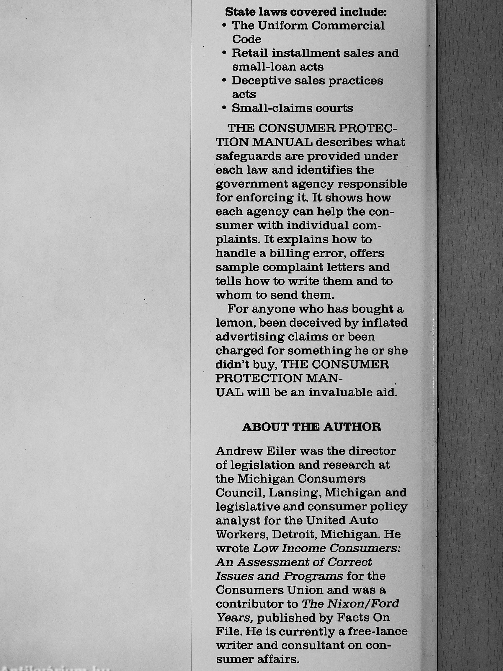 Andrew Eiler was the director of legislation and research at the Michigan Consumers Council, Lansing, Michigan and legislative and consumer policy analyst for the United Auto Workers, Detroit, Michigan. He wrote Low Income Consumers: An Assessment of Correct Issues and Programs for the Consumers Union and was a contributor to The Nixon/Ford Years, published by Facts On File. He is currently a free-lance ' writer and consultant on consumer affairs.