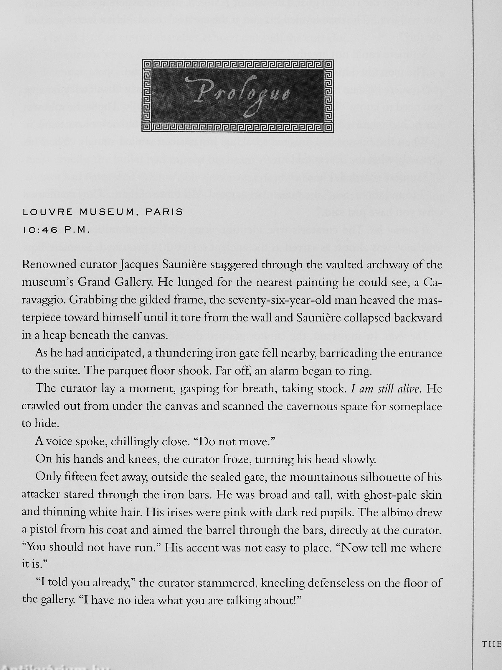 While in Paris on business, Harvard sym-bologist Robert Langdon receives an urgent late-night phone call.The elderly curator of the Louvie has been murdered inside the museum, a baffling cipher found near the body. As Langdon and a gifted French cryptologist, Sophie Neveu, sort through the bizarre riddles, they ate stimned to discover a trail of clues hidden in the works of DaVind—clues visible for all to see and yet ingeniously disguised by the painter.