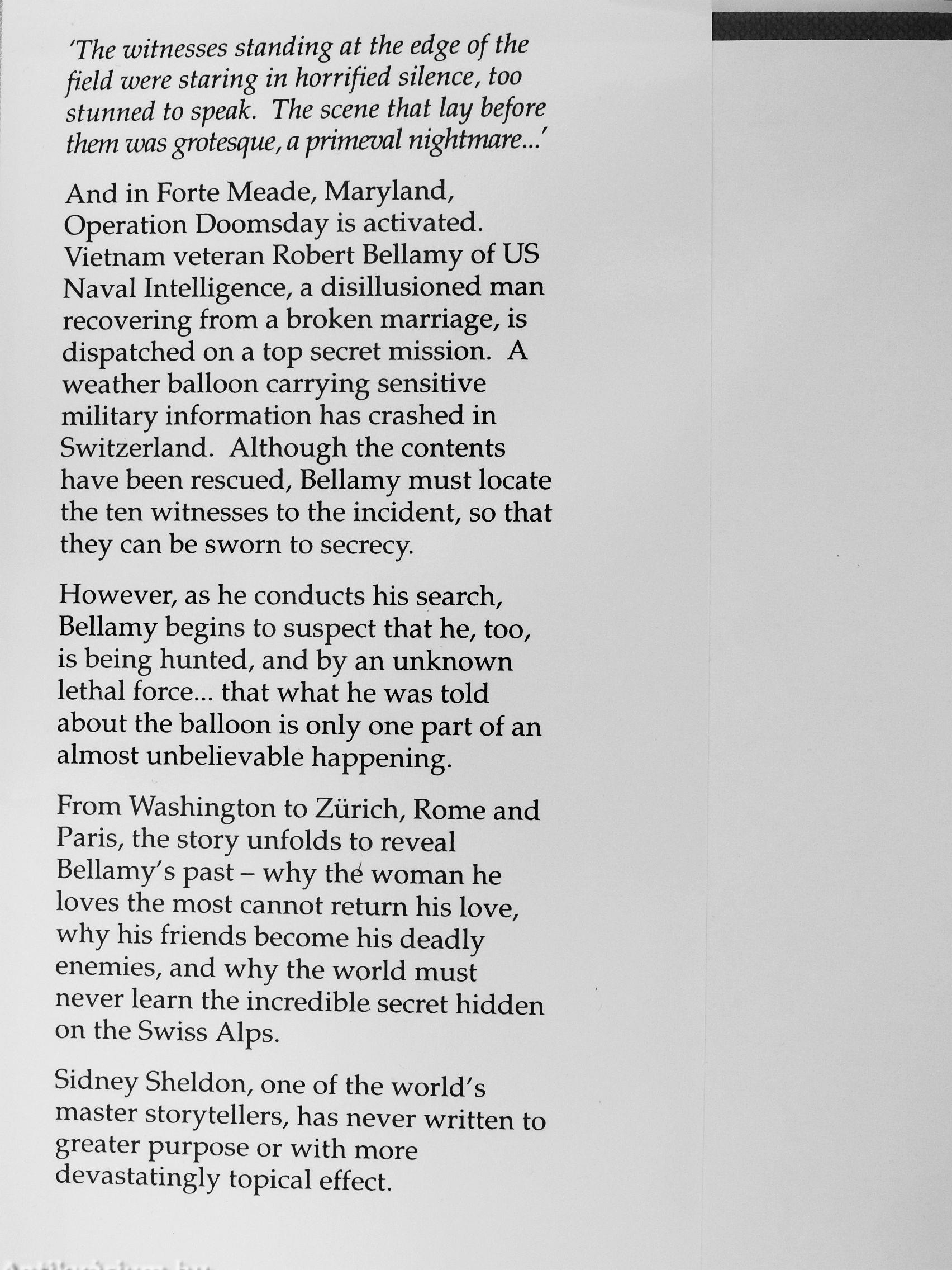 And in Forte Meade, Maryland, Operation Doomsday is activated. Vietnam veteran Robert Bellamy of US Naval Intelligence, a disillusioned man recovering from a broken marriage, is dispatched on a top secret mission. A weather balloon carrying sensitive military information has crashed in Switzerland. Although the contents have been rescued, Bellamy must locate the ten witnesses to the incident, so that they can be sworn to secrecy.