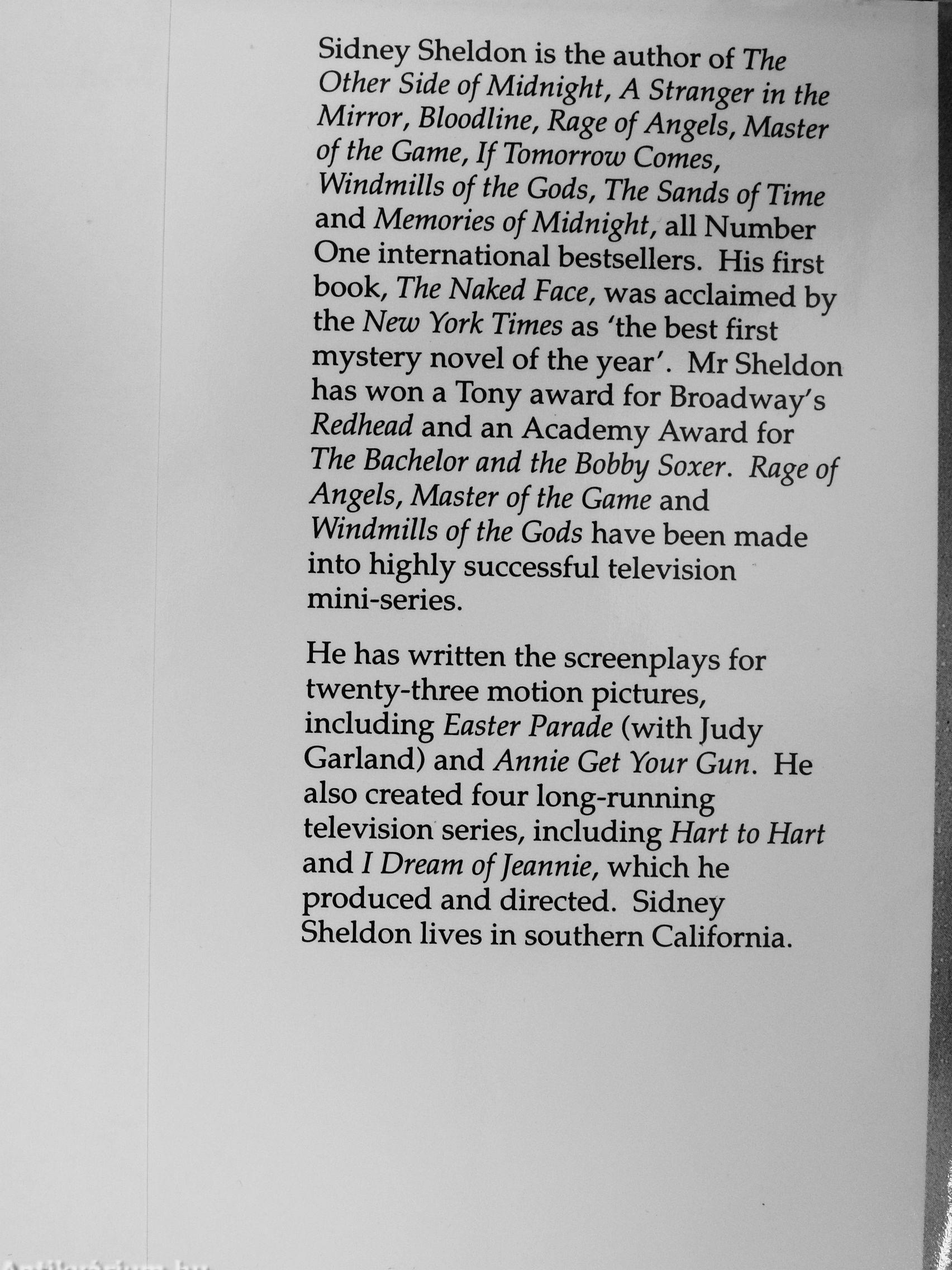 Sidney Sheldon is the author of The Other Side of Midnight, A Stranger in the Mirror, Bloodline, Rage of Angels, Master of the Game, If Tomorrow Comes, Windmills of the Gods, The Sands of Time and Memories of Midnight, all Number One international bestsellers. His first book. The Naked Face, was acclaimed by the New York Times as 'the best first mystery novel of the year'. Mr Sheldon has won a Tony award for Broadway's Redhead and an Academy Award for The Bachelor and the Bobby Soxer. Rage of Angels, Master of the Game and Windmills of the Gods have been made into highly successful television mini-series.