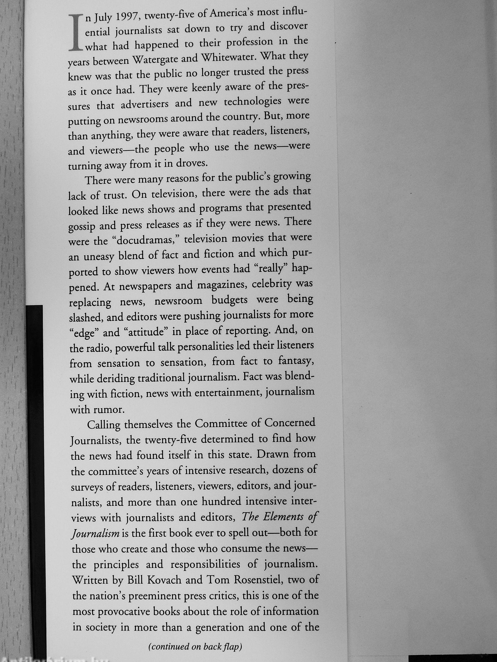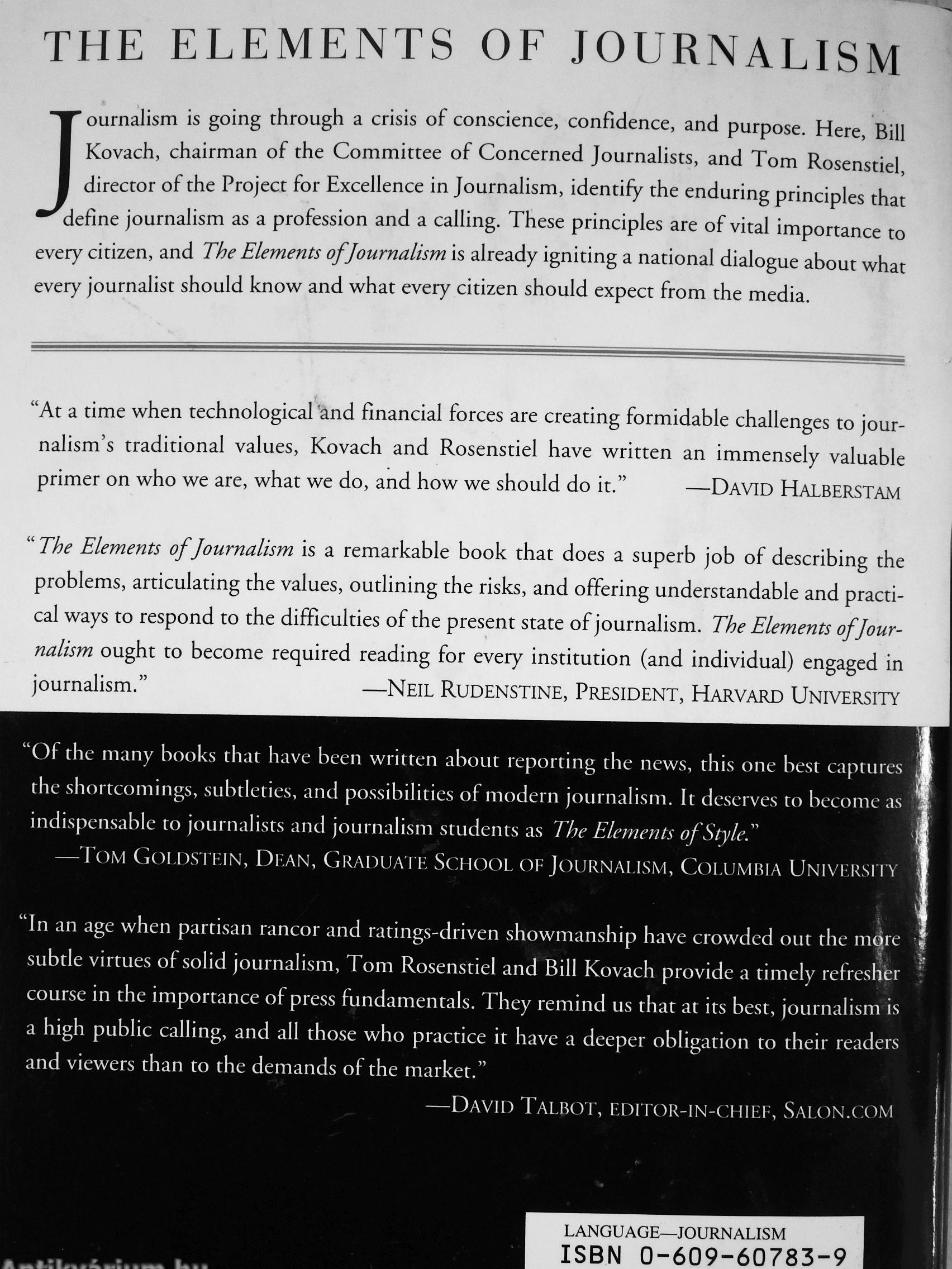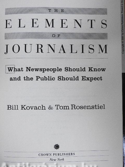 " The Elements of Journalism is a remarkable book that does a superb job of describing the problems, articulating the values, outlining the risks, and offering understandable and practical ways to respond to the difficulties of the present state of journalism. The Elements of Journalism ought to become required reading for every institution (and individual) engaged in journalism." —NeIL RUDENSTINE, PRESIDENT, HARVARD UNIVERSITY