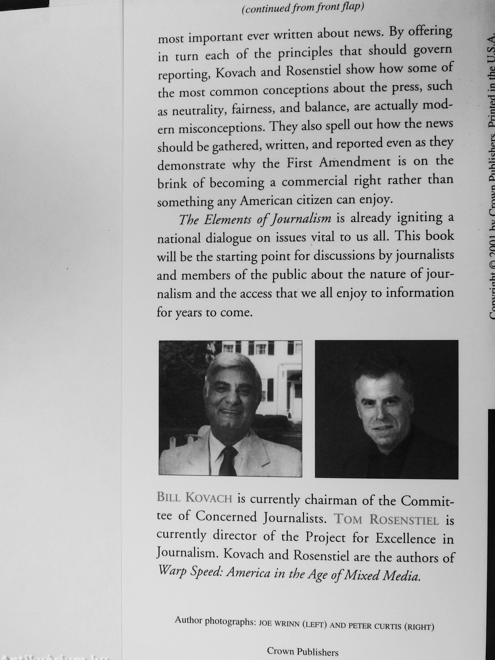 Bill Kovach is currently chairman of the Committee of Concerned Journalists. ToM rosenstiel is currently director of the Project for Excellence in Journalism. Kovach and Rosenstiel are the authors of Warp Speed: America in the Age of Mixed Media.
