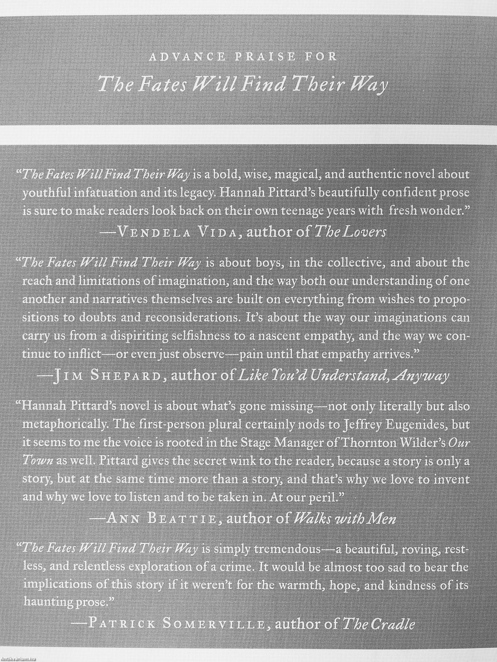 '^TheFates WtllF'tnd Their Way is a bold, wise, magical, and authentic novel about youthful infatuation and its legacy. Hannah Pittard's beautifully confident prose is sure to make readers look back on their own teenage years with fresh wonder." —Vend el a Vi da, author of T^^Zo-um