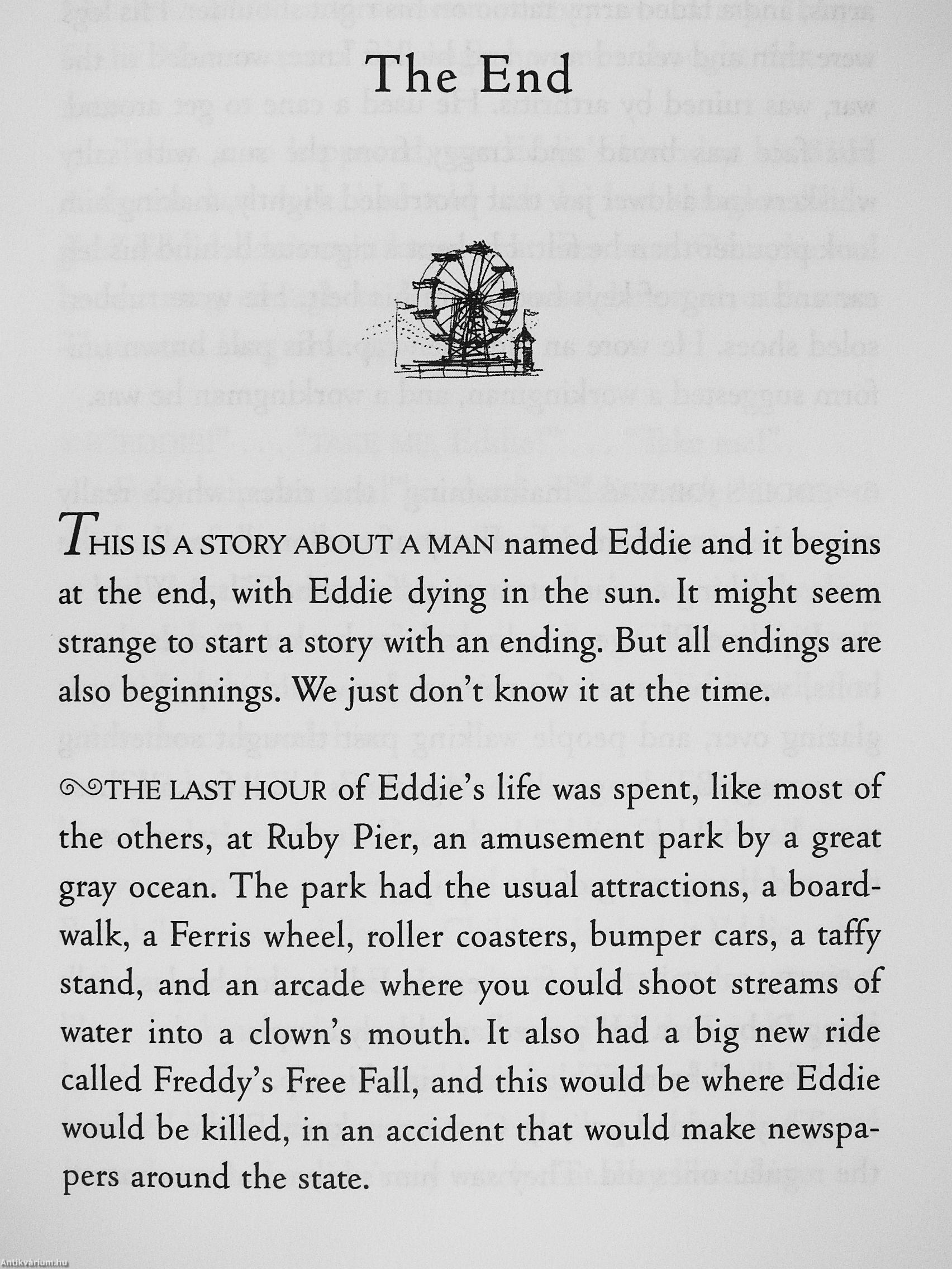 Then, on his 83rd birthday, Eddie dies in a tragic accident, trying to save a little girl from a falling cart. With his final breath, he feels two small hands in his—and then nothing. He awakens in the afterlife, where he learns that heaven is not a lush Garden of Eden, but a place where your earthly life is explained to you by five people who were in it. These people may have been loved ones or distant strangers. Yet each of them changed your path forever.