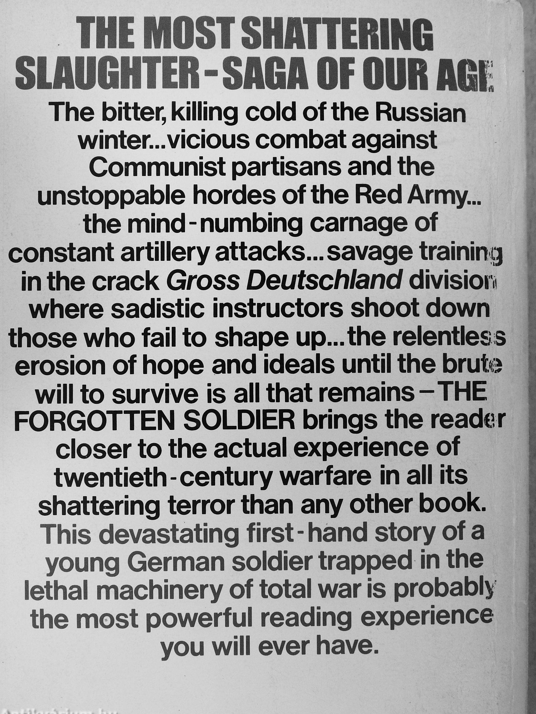 will to survive is all that remains-THE FORGOTTEN SOLDIER brings the reader closer to the actual experience of twentieth-century warfare in all its shattering terror than any other book. This devastating first-hand story of a young German soldier trapped in the lethal machinery of total war is probably the most powerful reading experience you will ever have.