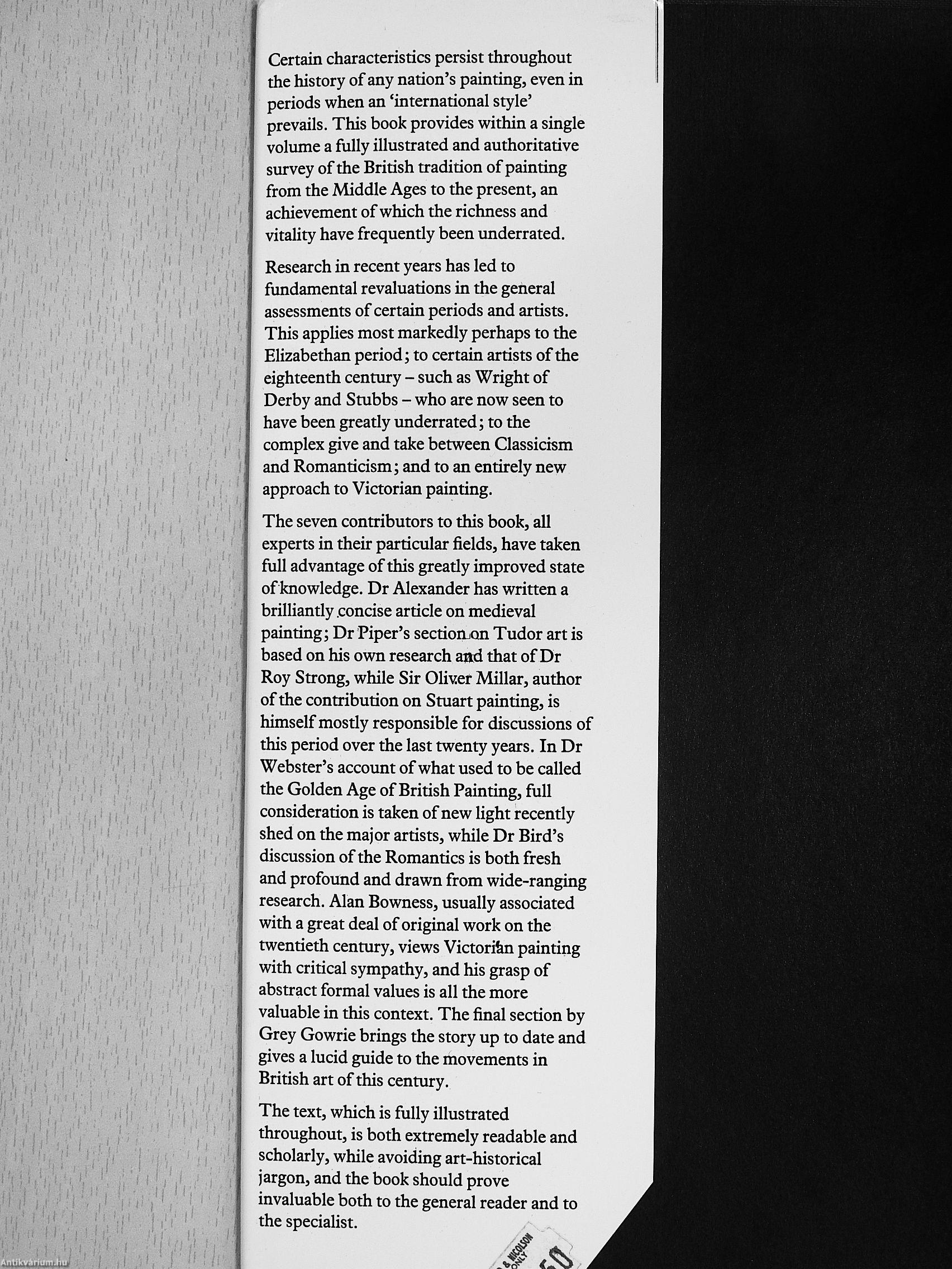 The seven contributors to this book, all experts in their particular fields, have taken full advantage of this greatly improved state of knowledge. Dr Alexander has written a brilliantly .concise article on medieval painting; Dr Piper's sectioiLon Tudor art is based on his own research and that of Dr Roy Strong, while Sir Oliver Millar, author of the contribution on Stuart painting, is himself mostly responsible for discussions of this period over the last twenty years. In Dr Webster's account of what used to be called the Golden Age of British Painting, full consideration is taken of new light recently shed on the major artists, while Dr Bird's discussion of the Romantics is both fresh and profound and drawn from wide-ranging research. Alan Bowness, usually associated with a great deal of original work on the twentieth century, views Victorian painting with critical sympathy, and his grasp of abstract formal values is all the more valuable in this context. The final section by Grey Gowrie brings the story up to date and gives a lucid guide to the movements in British art of this century.