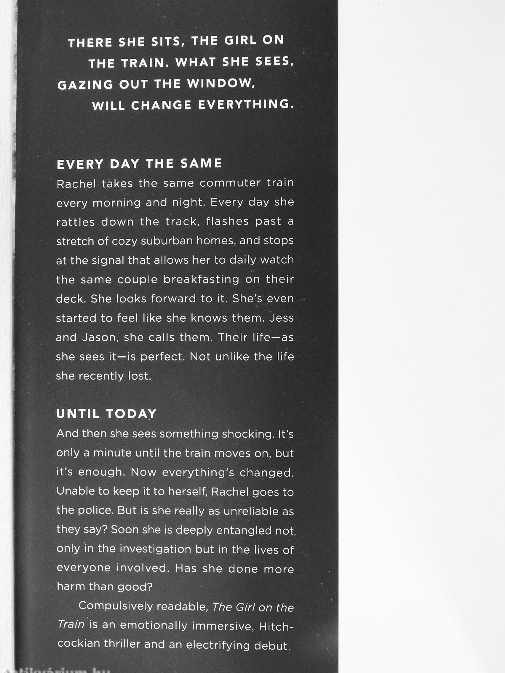 EVERY DAY THE SAME Rachel takes the same commuter train every morning and night. Every day she rattles down the track, flashes past a stretch of cozy suburban homes, and stops at the signal that allows her to daily watch the same couple breakfasting on their deck. She looks forward to it. She's even started to feel like she knows them. Jess and Jason, she calls them. Their life—as she sees it—is perfect. Not unlike the life she recently lost.