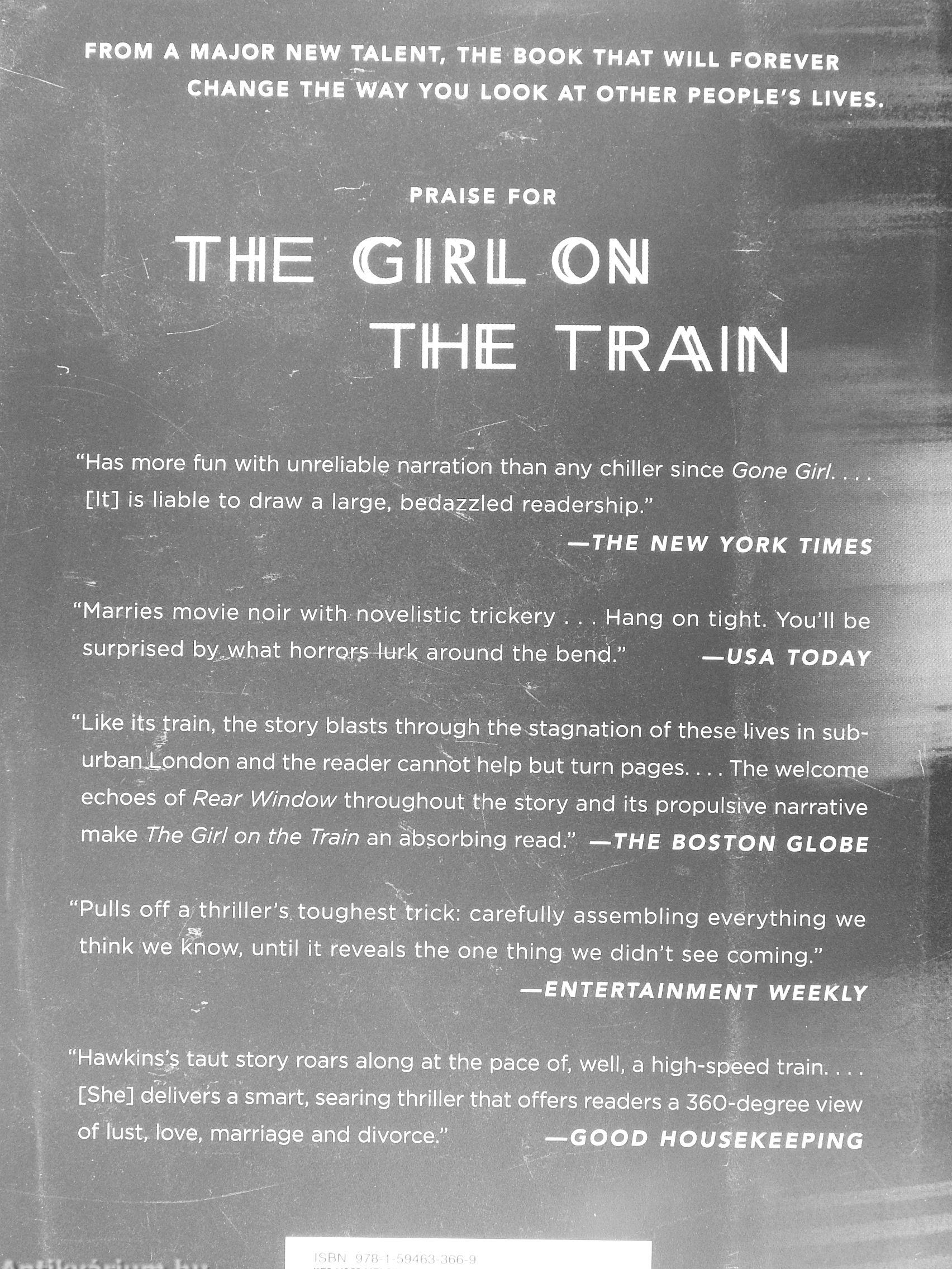 "Like its|rain, the story blasts through the stagnation of these lives in sub-urbaruLondon and the reader canrfot help but turn pages The welcora,^ echoes of Rear Window throughout the story and its propulsive narrative make The Girl on the Train an absorbing read." —THE BOSTON GLOBE