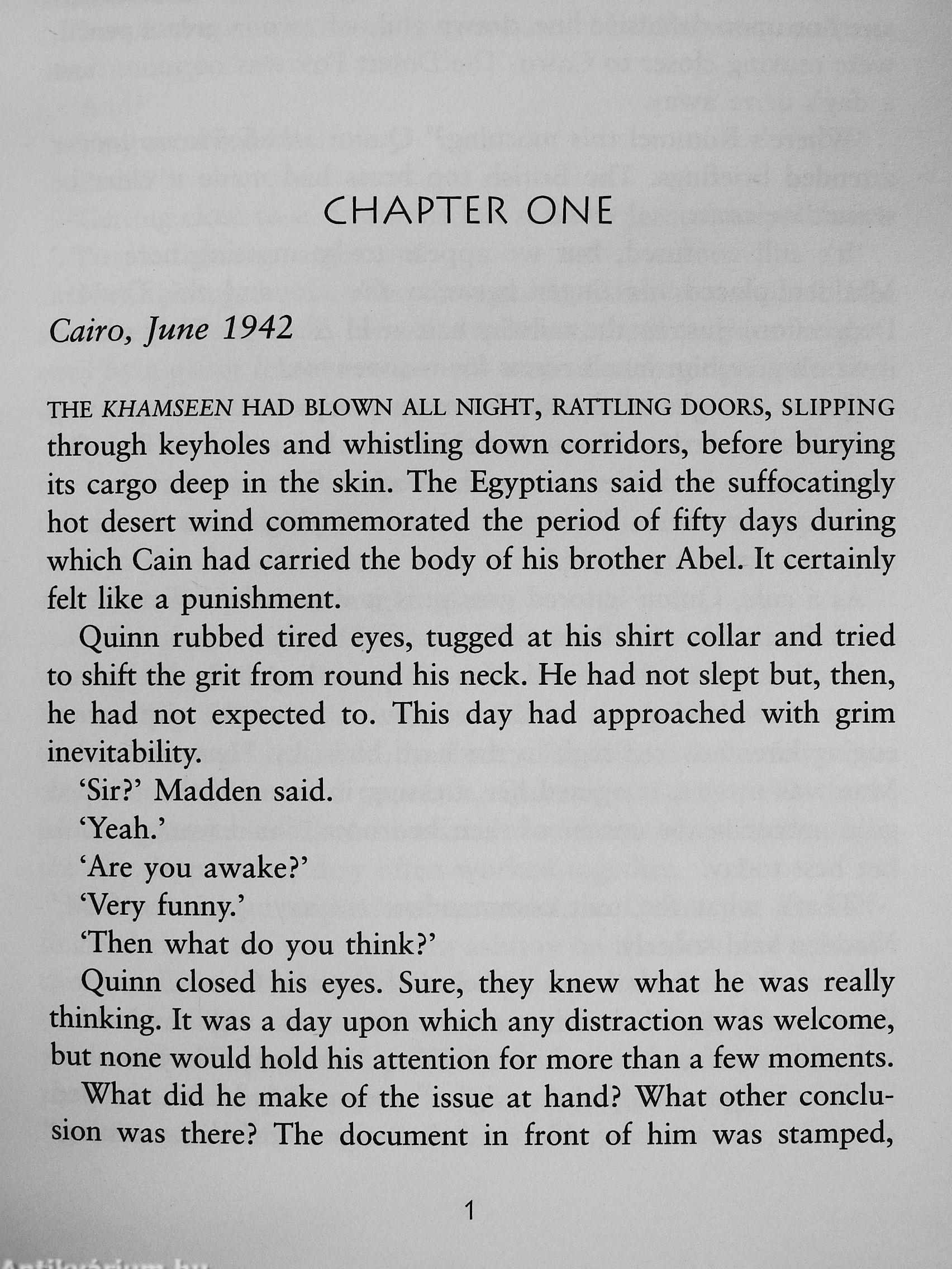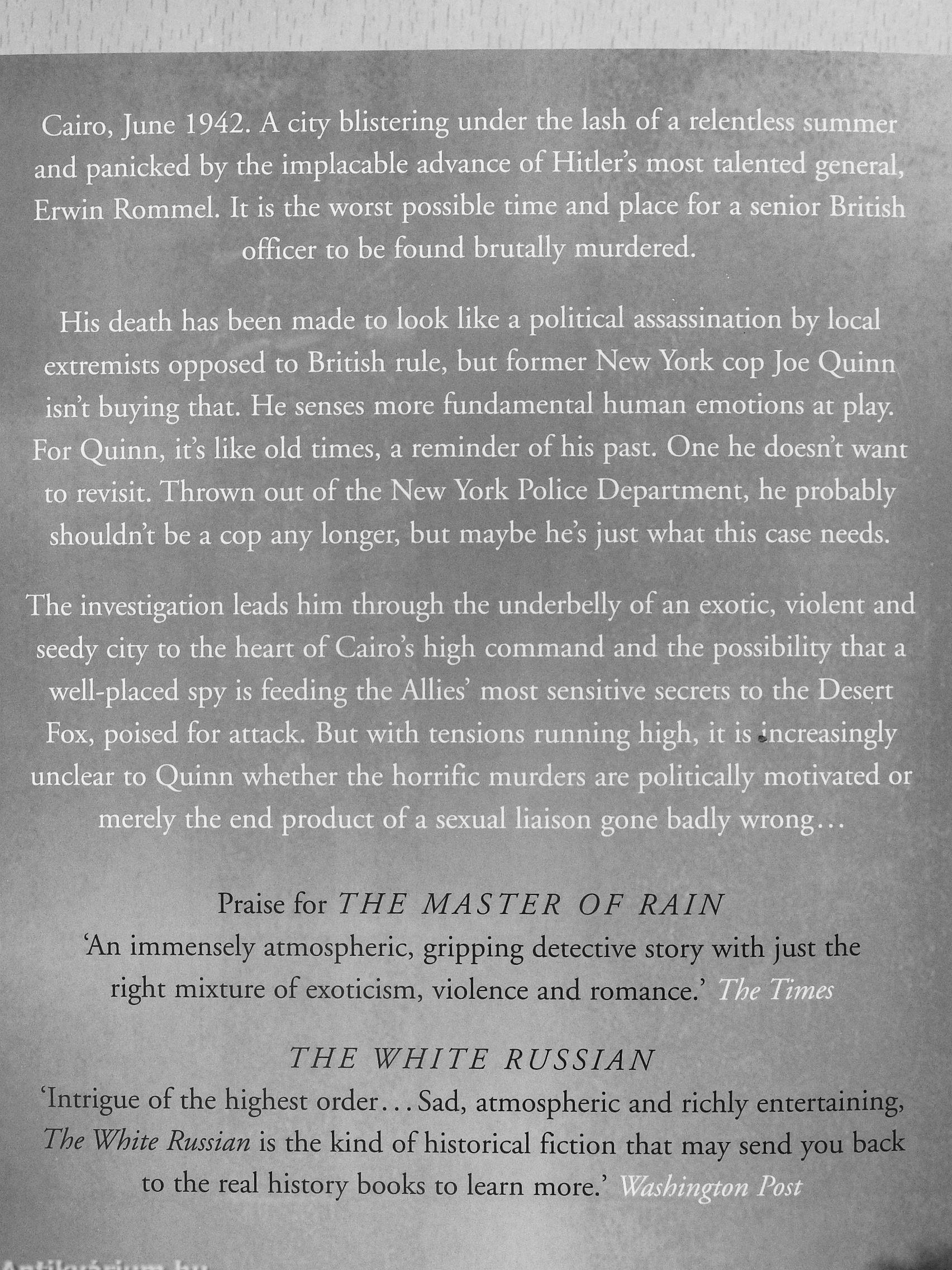 The investigation leads him through the underbelly of an exotic, violent and seedy city to the heart of Cairo's high command and the possibility that a well-placed spy is feeding the Allies' most sensitive secrets to the Desert Fox, poised for attack. But with tensions running high, it is increasingly unclear to Quinn whether the horrific murders are politically motivated or merely the end product of a sexual liaison gone badly wrong