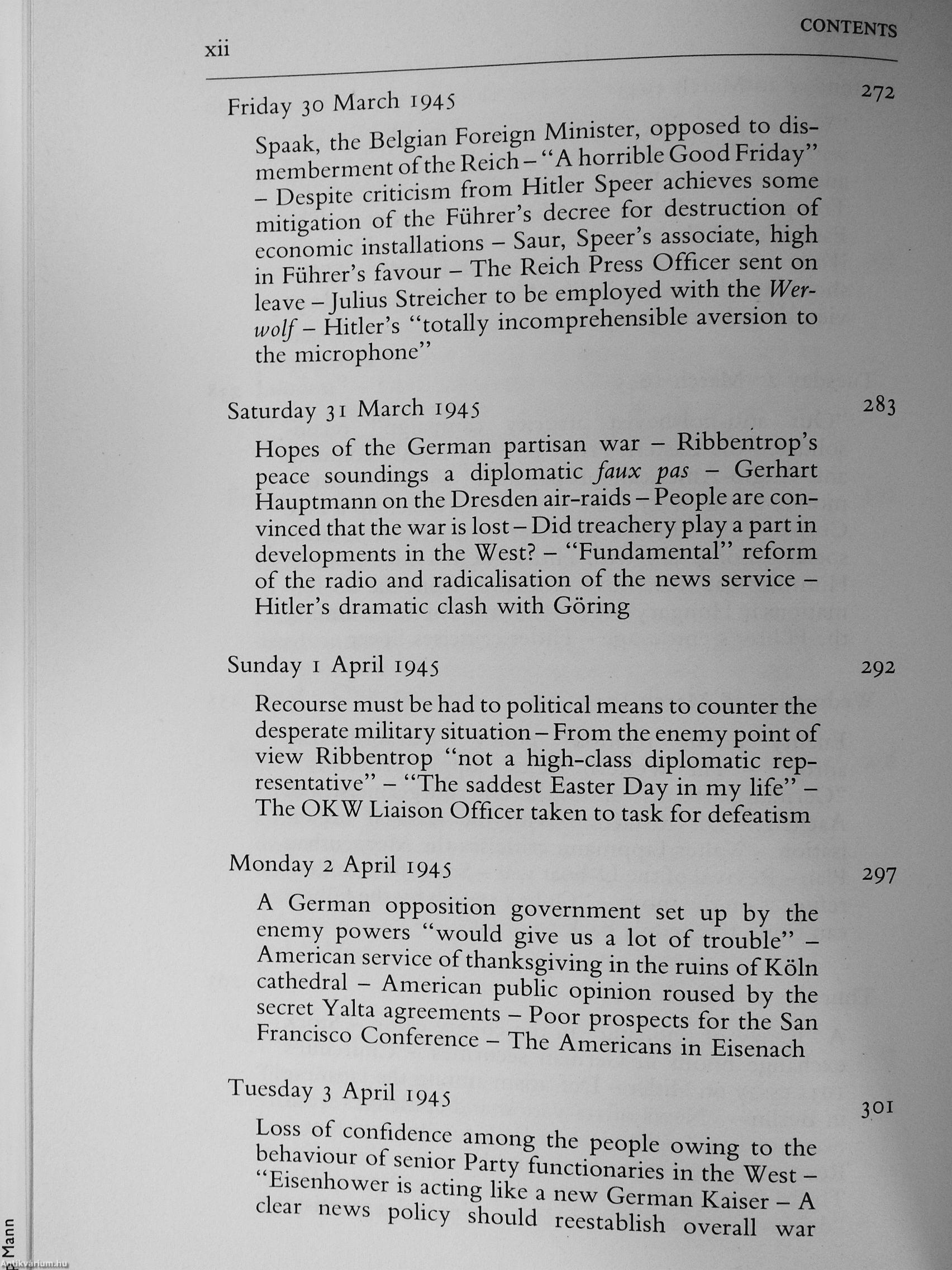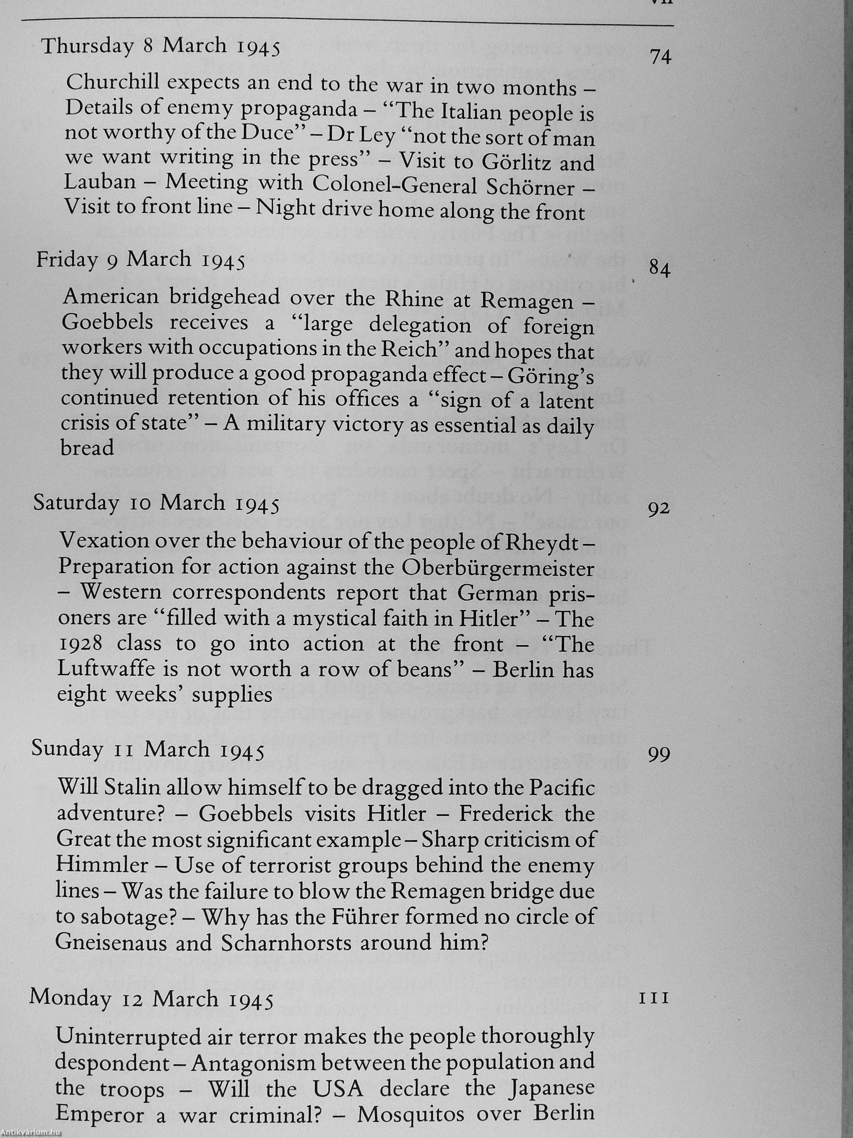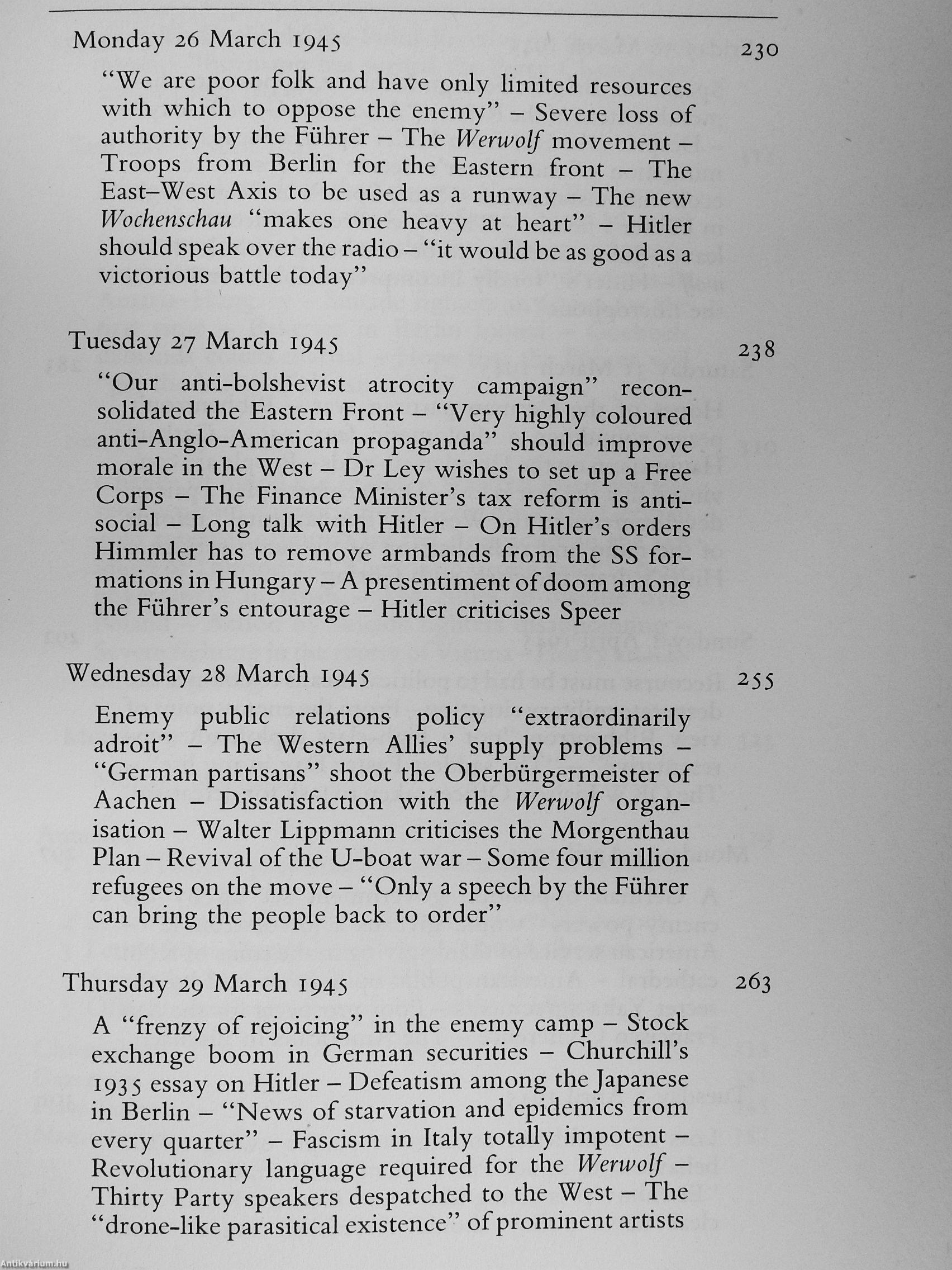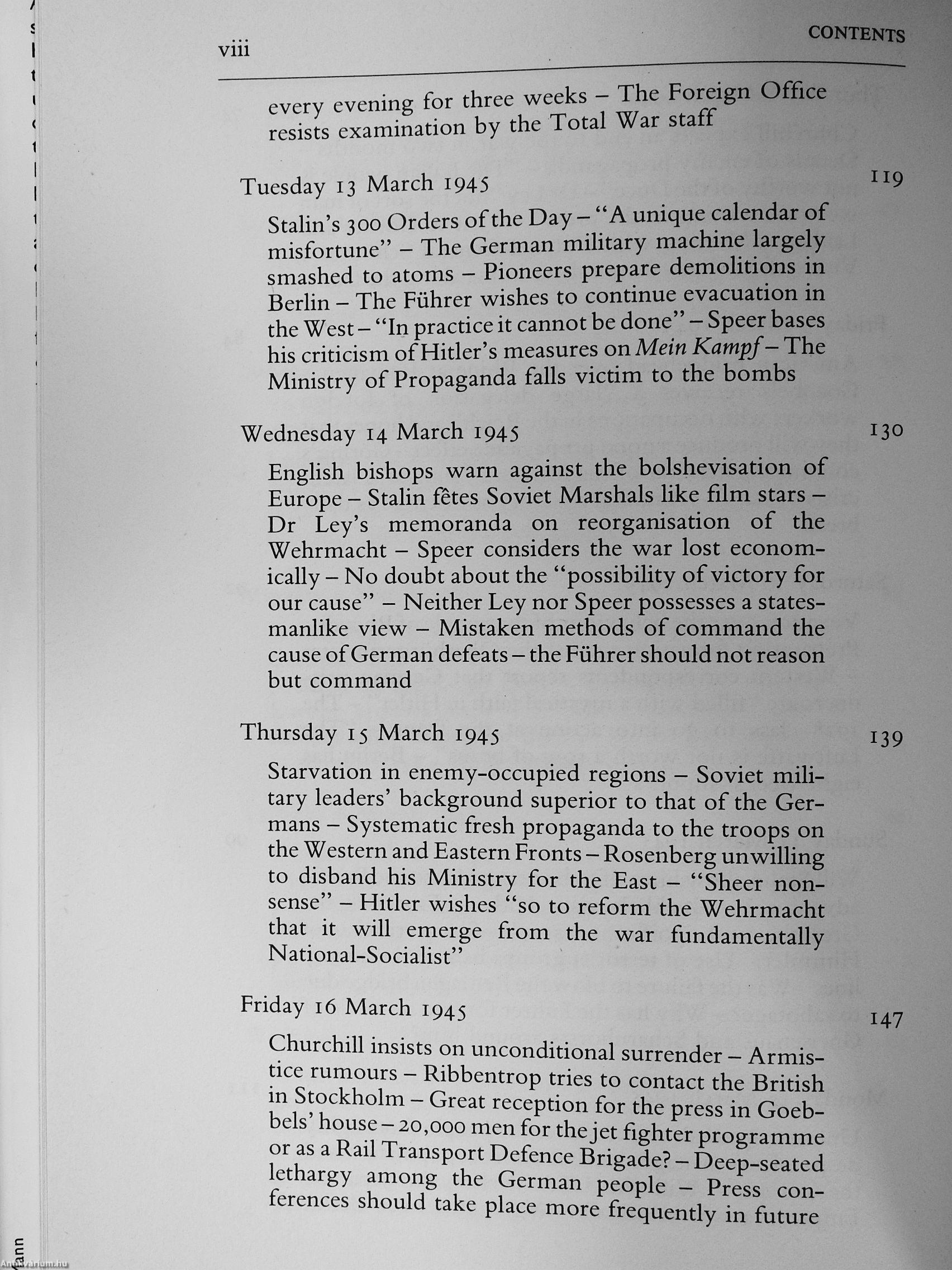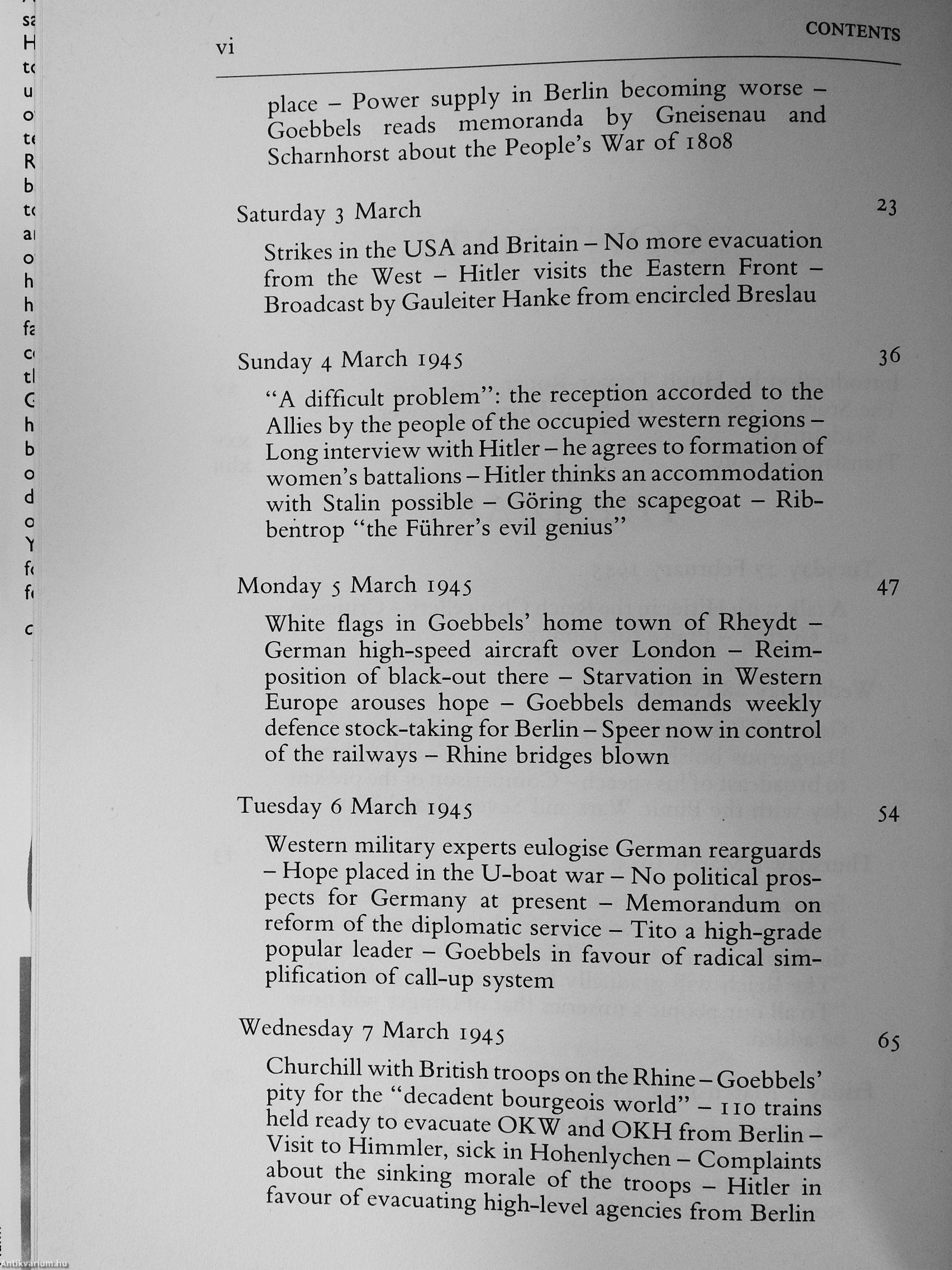 AS THE WRECKAGE OF THE THOU-sand-year Reich collapsed about him, Hitler's Minister of Propaganda continued to dictate his diary. Here, unrevised, uncorrected, authentic, are the reactions of Hitler's most consistently faithful lieutenant, set down as the lines buckled, as Russian and Allied pressure bore in on the battered capital of the empire that was not to be. Here, in this absorbing document, are the reservations, the hopes, the plans, of a dedicated servant unable to comprehend the scale of the disaster that was upon him. Here, in the tones of a man racked by fatigue but unbreakably optimistic, are the comments of an observer closer to the throne than it was wise to be. Here Goebbels sets down, without qualification, his reactions to the horror that Europe had become, his revulsion at the attitudinizing of the 'criminals' and 'villains' who were destroying the Fuhrer's notion of Europe, of the world. Here are his suspicions of the Yalta share-out, his sceptical predictions for the outcome of the 'San Fiasco' conference, the desperate rationalizations of a