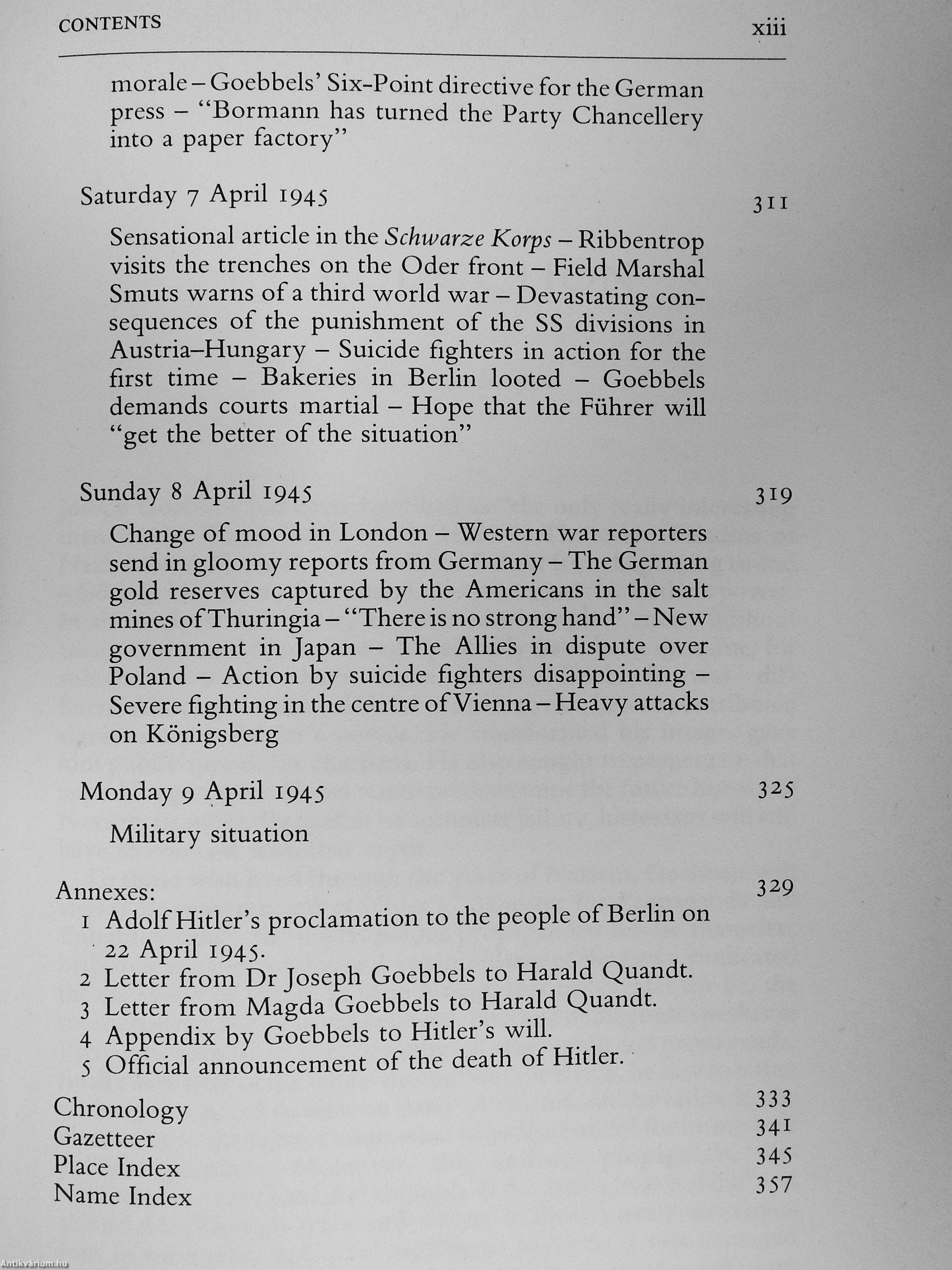 AS THE WRECKAGE OF THE THOU-sand-year Reich collapsed about him, Hitler's Minister of Propaganda continued to dictate his diary. Here, unrevised, uncorrected, authentic, are the reactions of Hitler's most consistently faithful lieutenant, set down as the lines buckled, as Russian and Allied pressure bore in on the battered capital of the empire that was not to be. Here, in this absorbing document, are the reservations, the hopes, the plans, of a dedicated servant unable to comprehend the scale of the disaster that was upon him. Here, in the tones of a man racked by fatigue but unbreakably optimistic, are the comments of an observer closer to the throne than it was wise to be. Here Goebbels sets down, without qualification, his reactions to the horror that Europe had become, his revulsion at the attitudinizing of the 'criminals' and 'villains' who were destroying the Fuhrer's notion of Europe, of the world. Here are his suspicions of the Yalta share-out, his sceptical predictions... Tovább