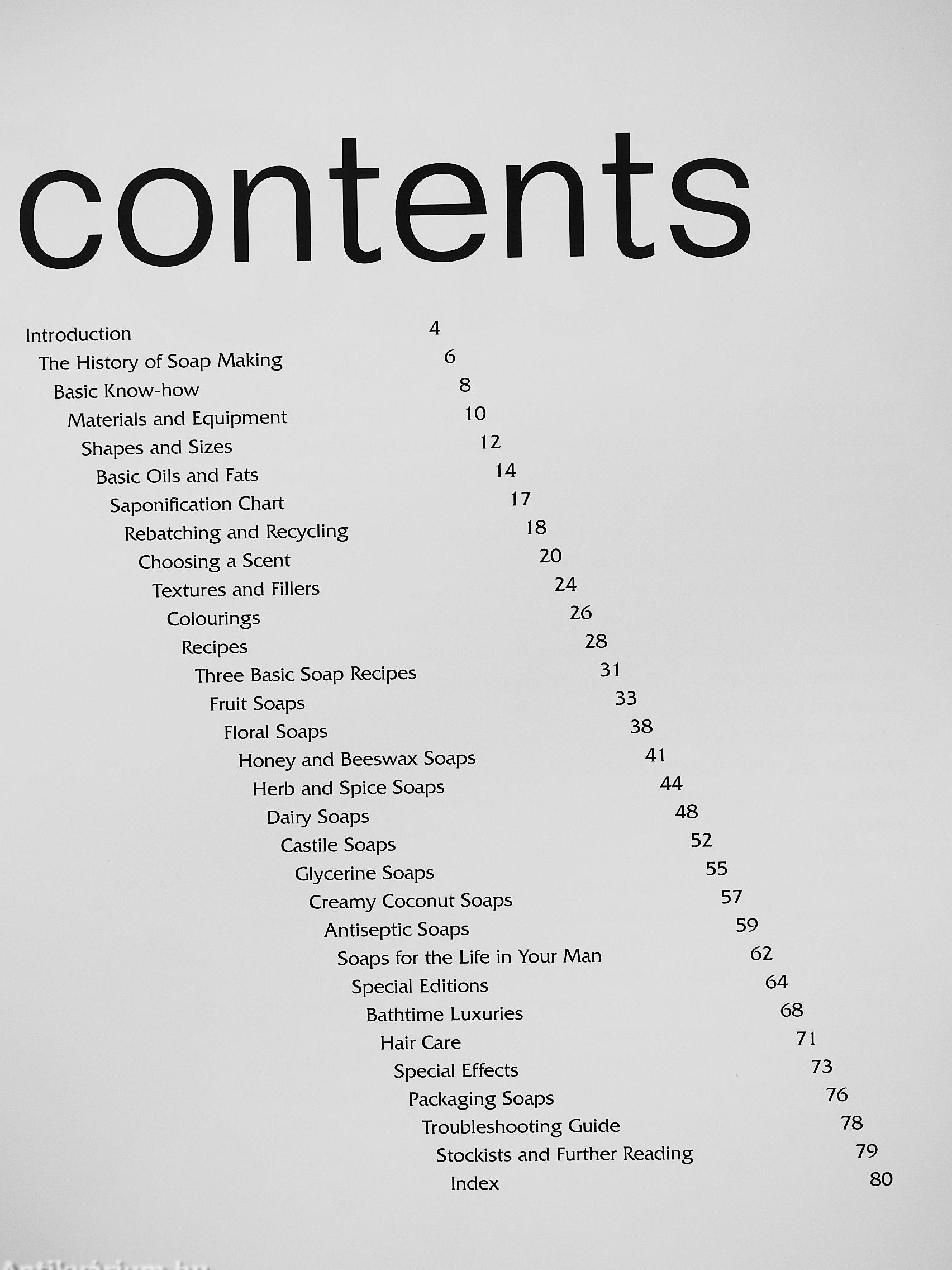 From one basic recipe, you will be able to make an enormous variety of soaps using kitchen cupboard ingredients and readily available fragrances. Make strawberry soap, goat's milk and ylang ylang, or calendula and sunflower. Try your hand at clear glycerine bars or coconut ice soap. Or, for men, there are minty and pine soaps, cleansing bars for greasy hands and spicy slabs fragranced with cinnamon and ginger. Soaps for gardeners, antiseptic soaps, shampoo bars, hair rinses and bathtime oils and scrubs are also included.