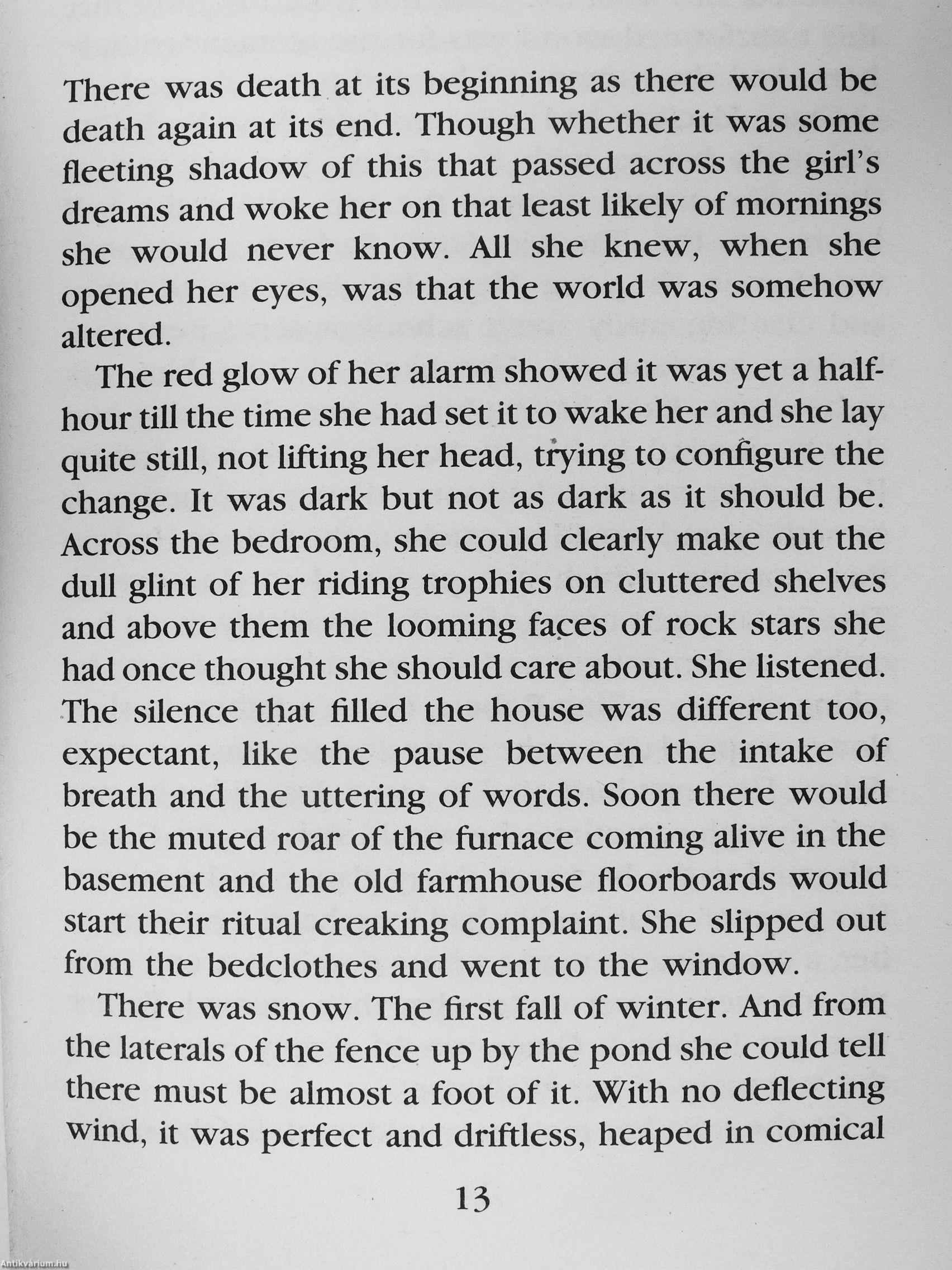 In the still of a snow-covered morning in upstate New York, a 40-ton truck jack-knifes out of control hitdng a young girl out riding her horse. Though horribly injured, both thirteen-year-old Grace Maclean and her horse Pilgrim survive. But the impact of the ordeal on their lives and on the lives of those who love them is devastating.