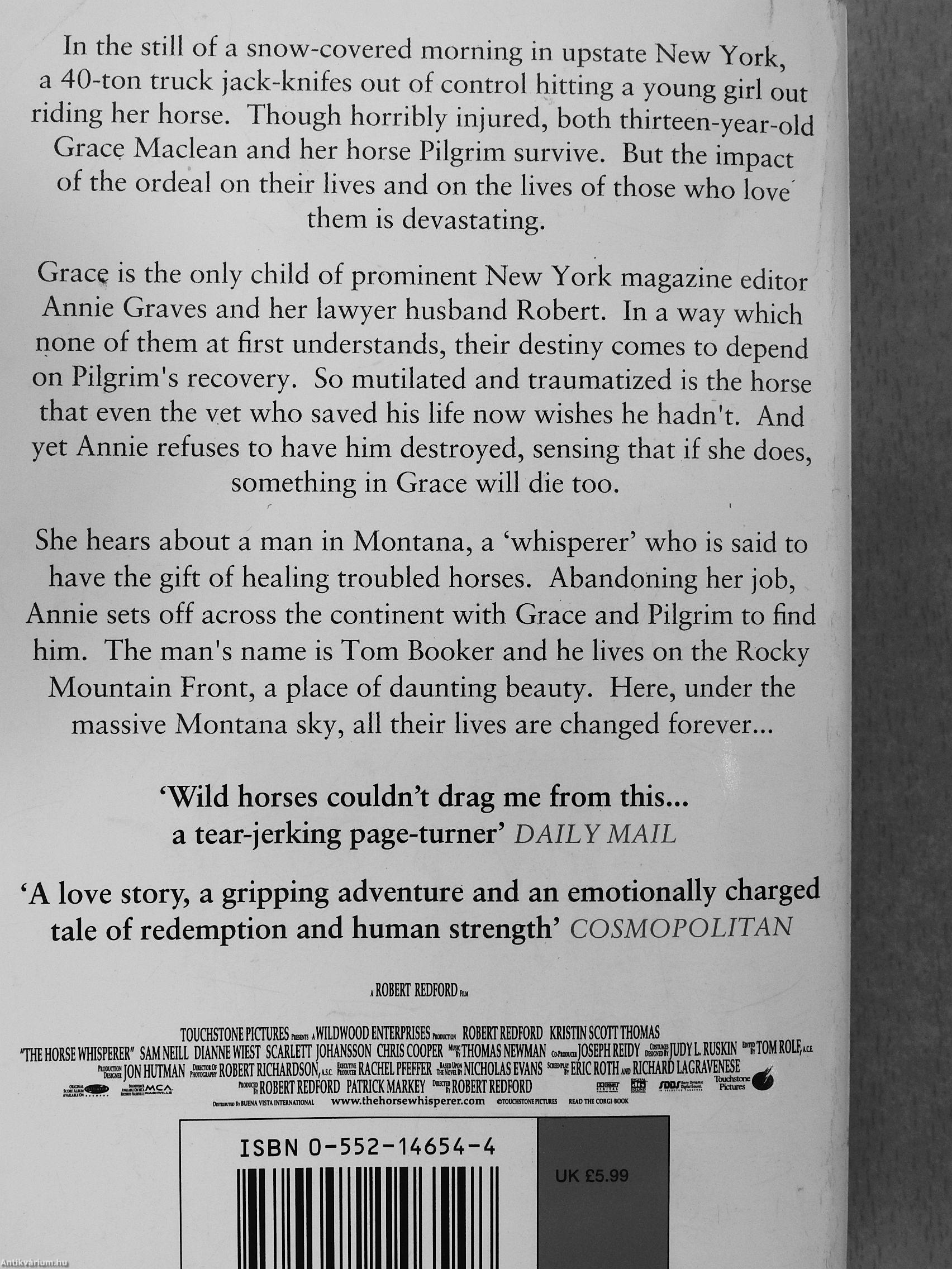 She hears about a man in Montana, a 'whisperer' who is said to have the gift of healing troubled horses. Abandoning her job, Annie sets off across the continent with Grace and Pilgrim to find him. The man's name is Tom Booker and he lives on the Rocky Mountain Front, a place of daunting beauty. Here, under the massive Montana sky, all their lives are changed forever