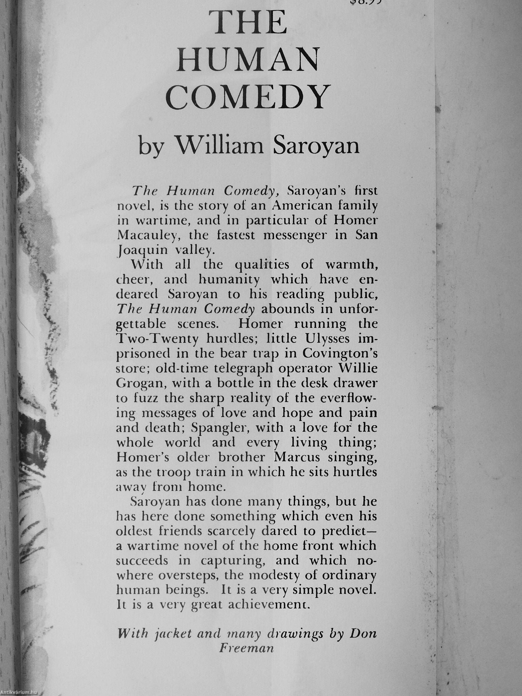 With all the qualities of warmth, cheer, and humanity which have endeared Saroyan to his reading public. The Human Comedy abounds in unforgettable scenes. Homer running the Two-Twenty hurdles; little Ulysses imprisoned in the bear trap in Covington's store; old-time telegraph operator Willie Grogan, with a bottle in the desk drawer to fuzz the sharp reality of the ever flowing messages of love and hope and pain and death; Spangler, with a love for the whole world and every living thing; Homer's older brother Marcus singing, as the troop train in which he sits hurtles away from home.
