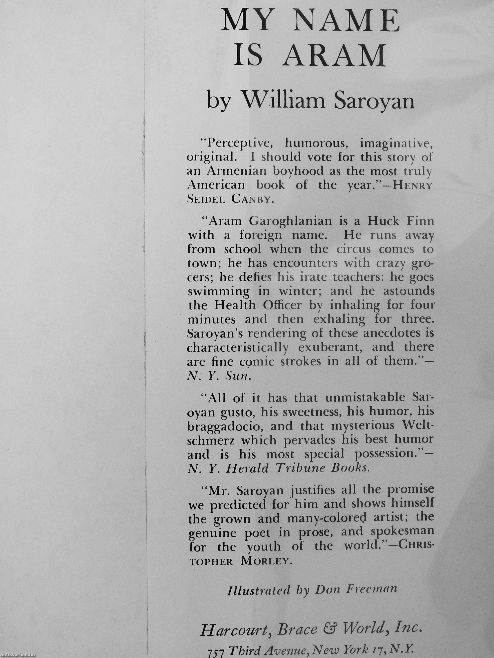 "Perceplive, humorous, imaginative, original. I should vote for this story of an Armenian boyhood as the most truly American book of the year."—Hknry .SKn)KL Can by.