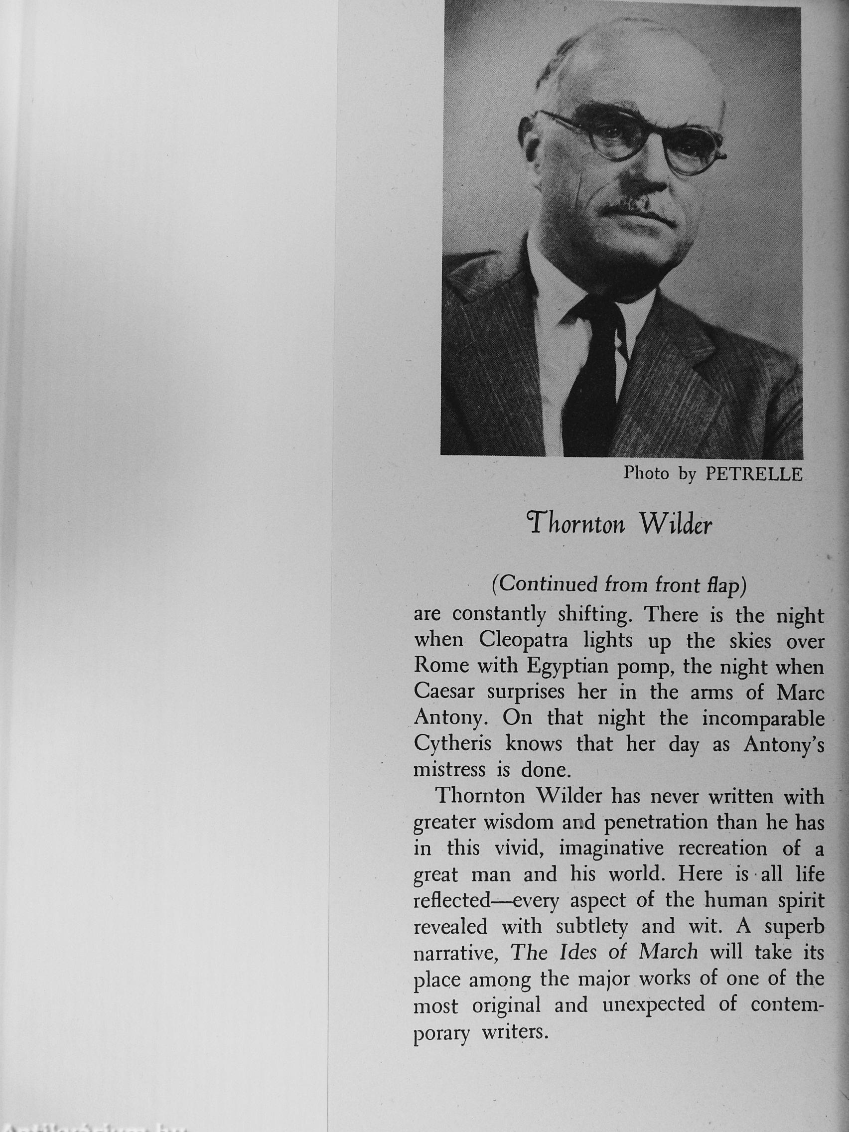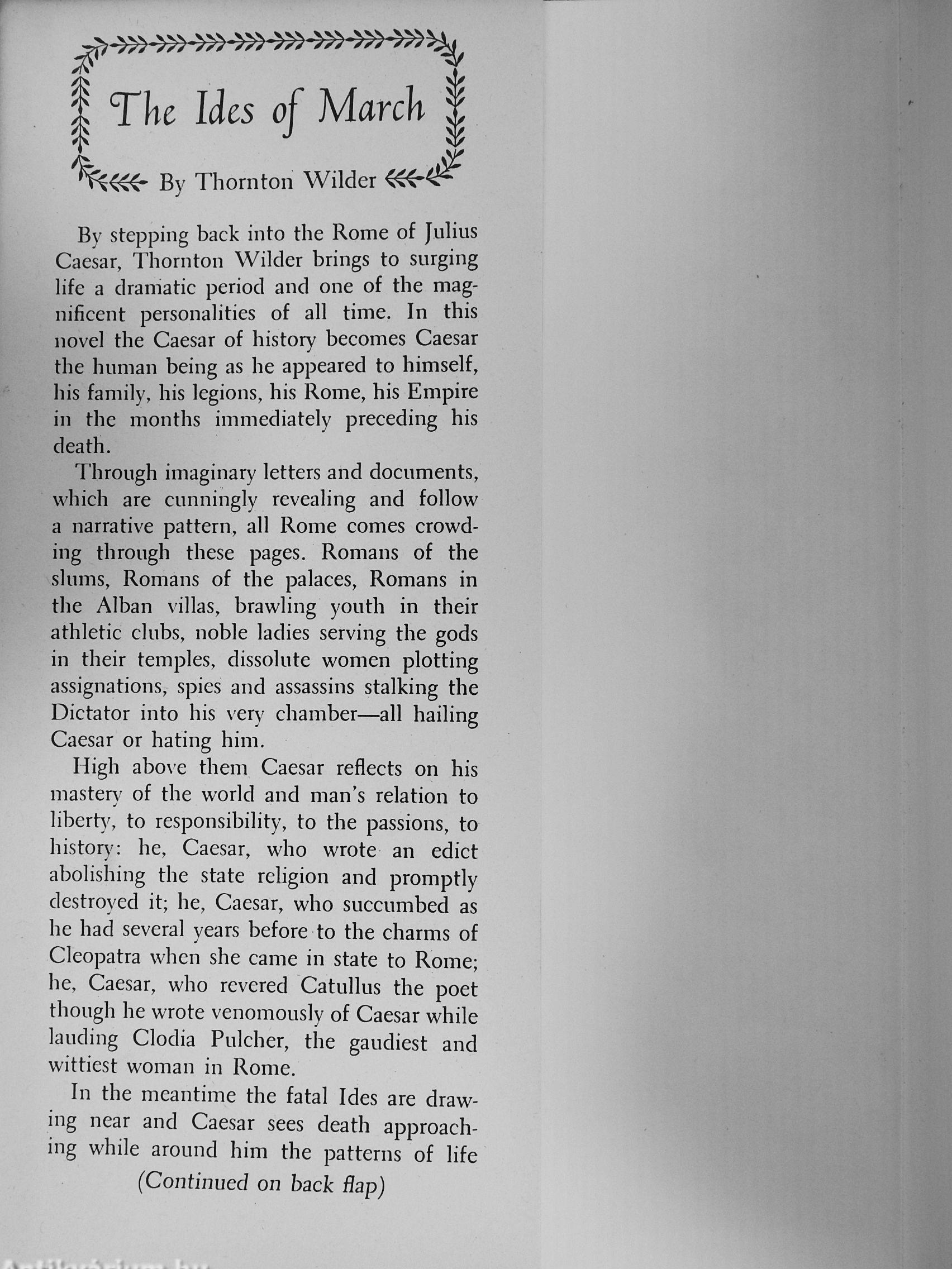 Thornton Wilder has never written with greater wisdom and penetration than he has in this vivid, imaginative recreation of a great man and his worid. Here is all life reflected—every aspect of the human spirit revealed with subtlety and wit. A superb narrative. The Ides of March will take its place among the major works of one of the most original and unexpected of contemporary writers.