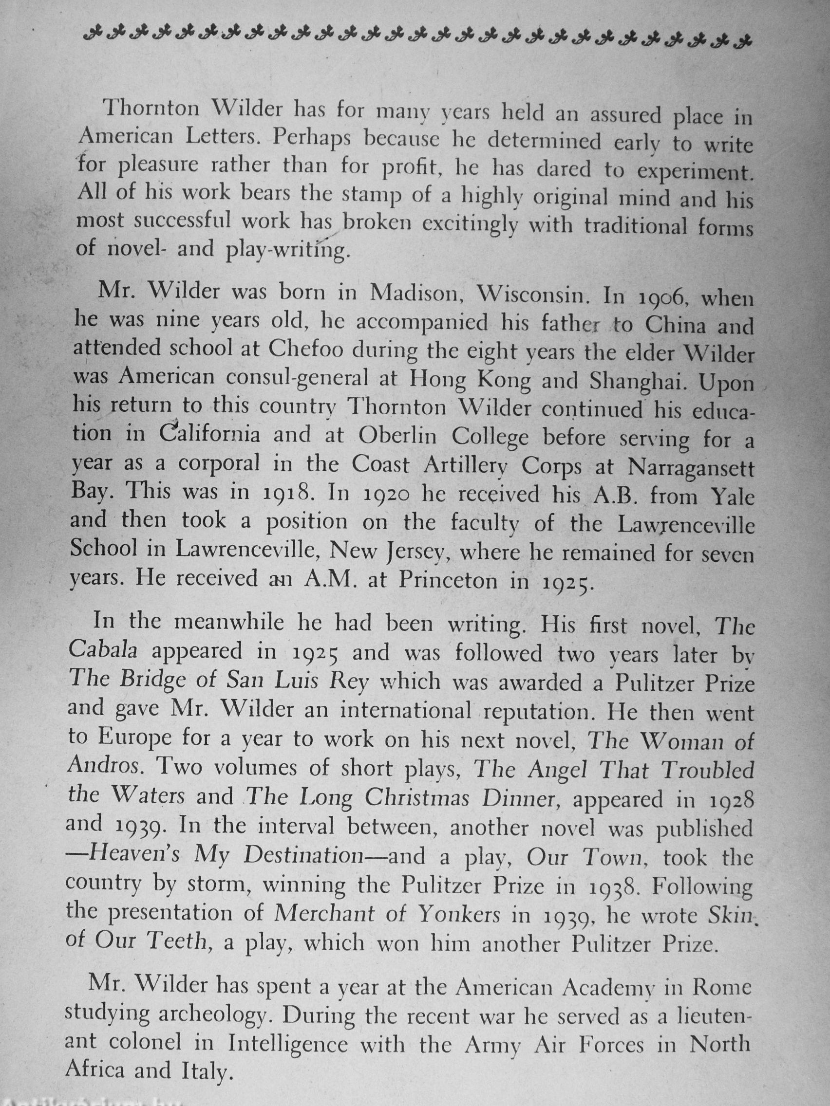 Mr. Wilder was born in Madison, Wisconsin. In 1906, when he was nine years old, he accompanied his father to China and attended school at Chefoo during the eight years the elder Wilder was American consul-gencral at Hong Kong and Shanghai. Upon his return to this country Thornton Wilder continued his education in California and at Obcrlin College before serving for a year as a corporal in the Coast Artillery Corps at Narragansett Bay. Tliis was in 1918. In 1920 he received his A.B. from Yale and then took a position on the faculty of the Lawjence\ illc School in Lawrencevillc, New Jersey, where he remained for seven years. He received a4i A.M. at Princeton in 1925.