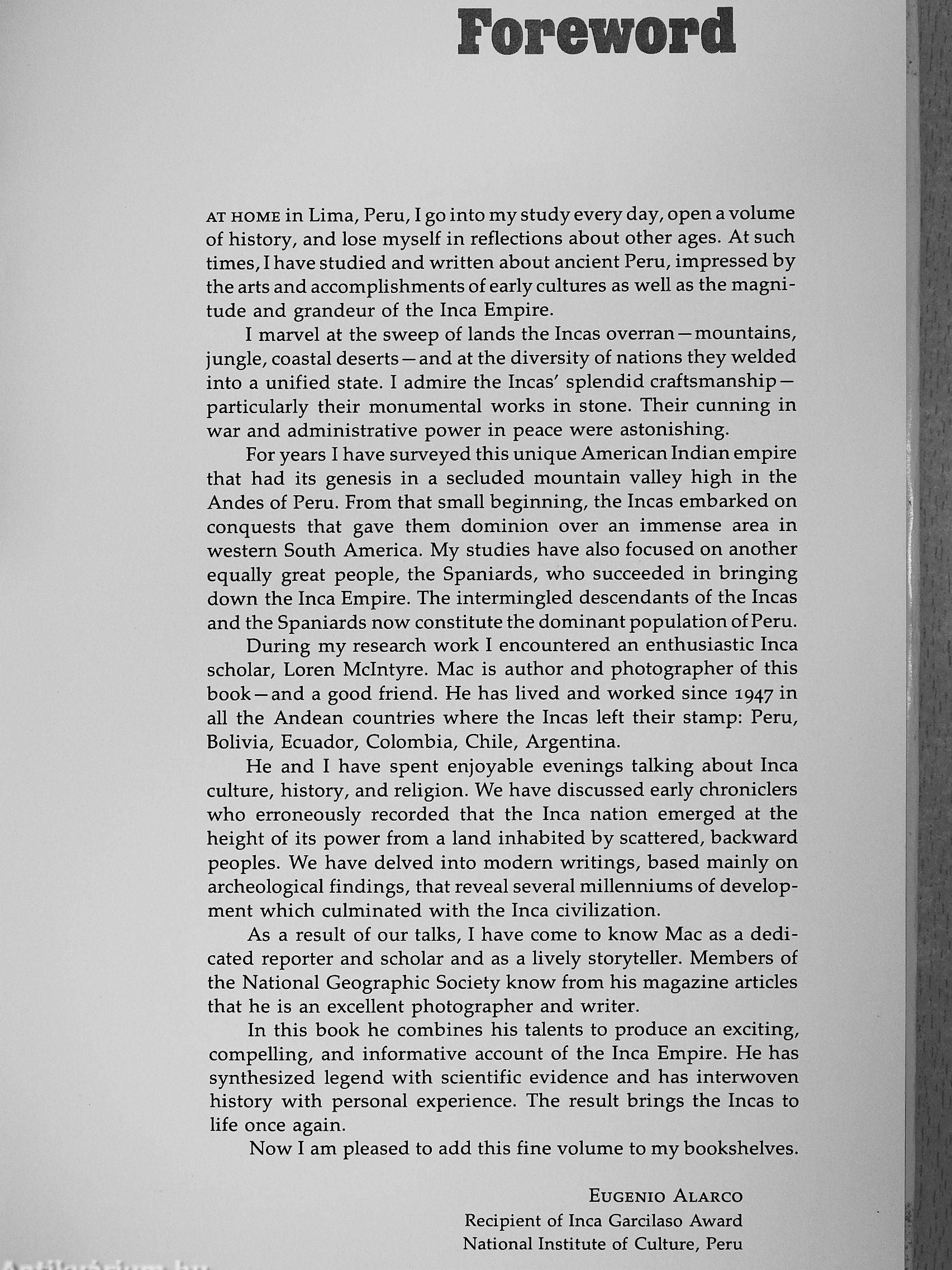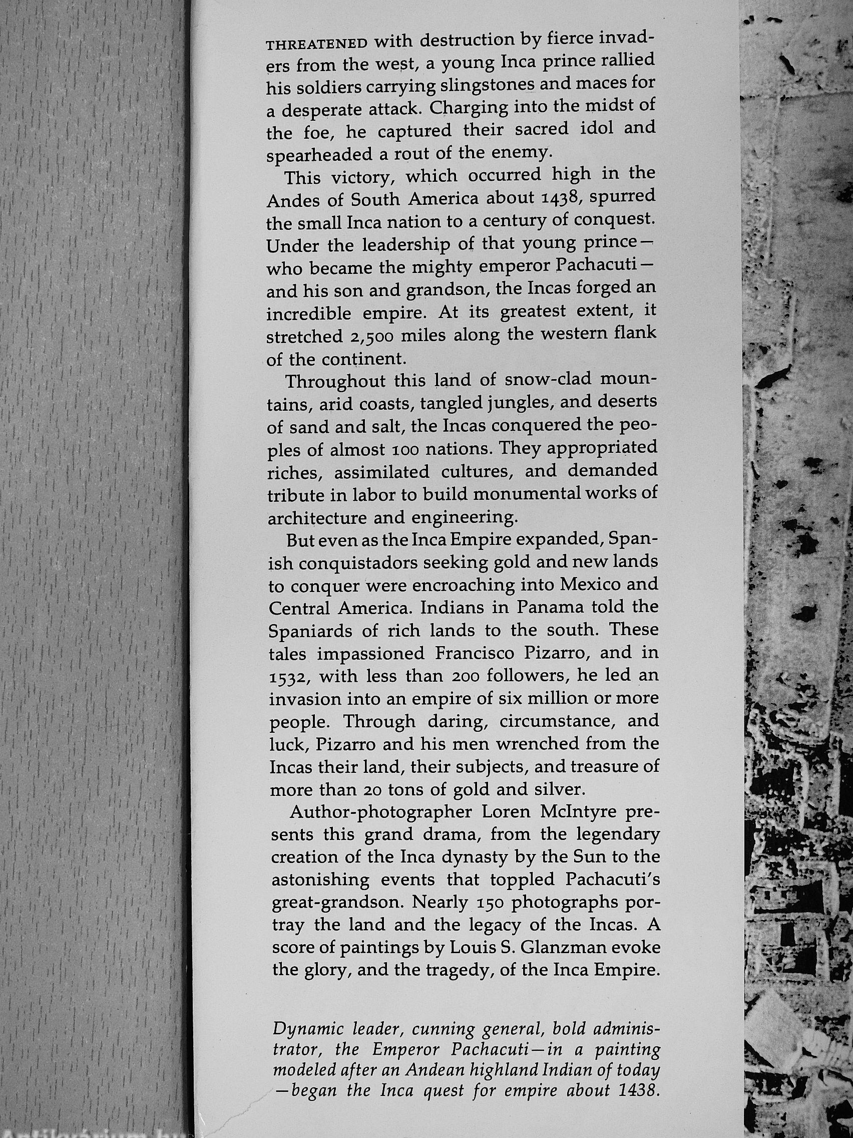 Author-photographer Loren Mclntyre presents this grand drama, from the legendary creation of the Inca dynasty by the Sun to the astonishing events that toppled Pachacuti's great-grandson. Nearly 150 photographs portray the land and the legacy of the Incas. A score of paintings by Louis S. Glanzman evoke the glory, and the tragedy, of the Inca Empire.
