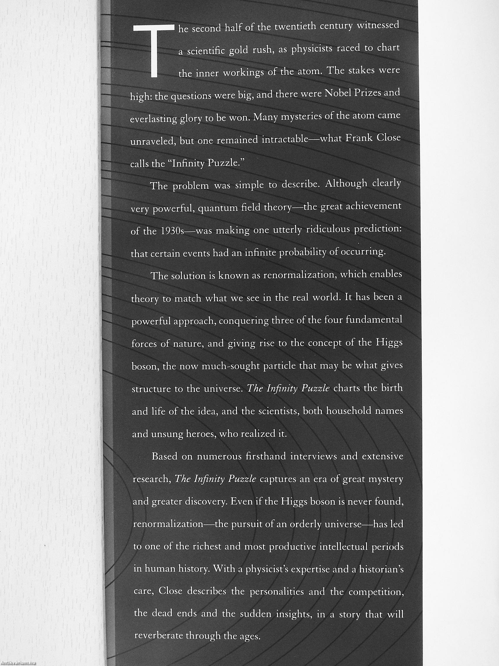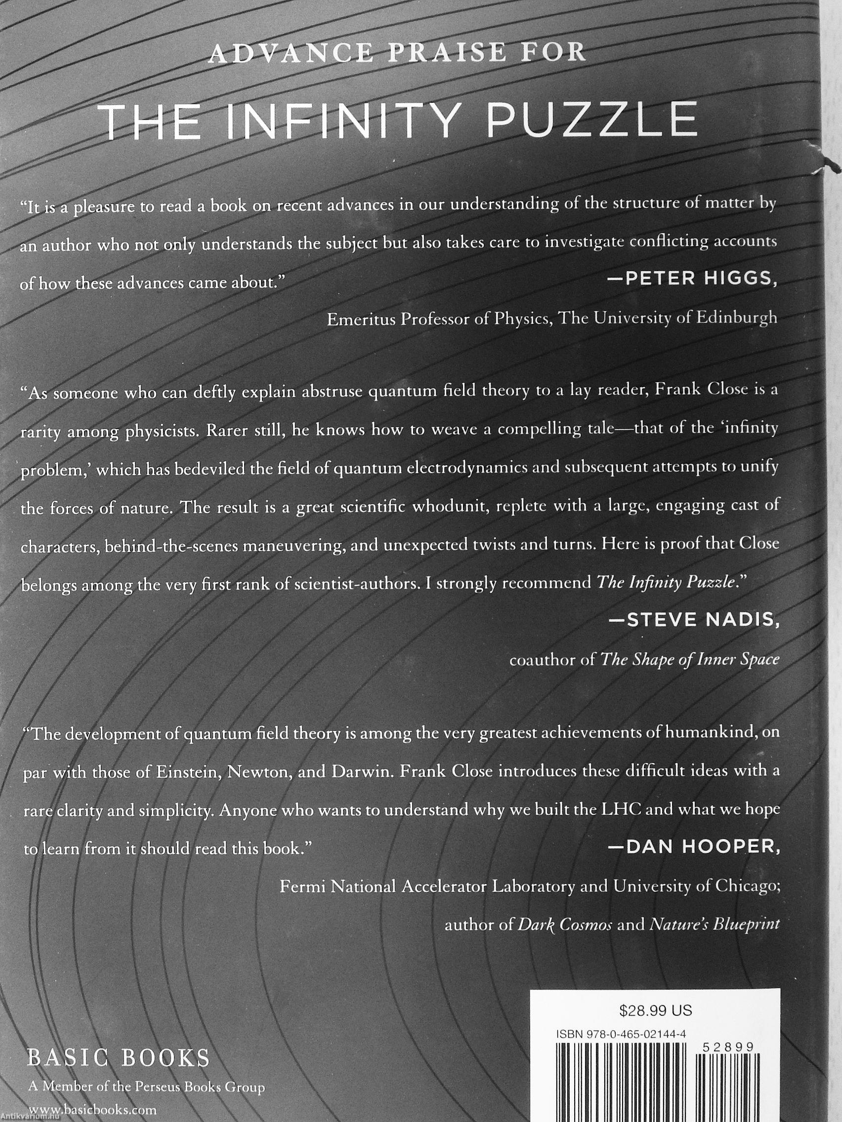 "As someone who can defdy explain abstruse quantum field theory to a lay reader, Frank Close is a rarity among physicists. Rarer still, he knows how to weave a compelling tak-—that of the 'infinity problem,' which has bedeviled the field of quantum electrodynamics and subsequent attempts to unify the forces of nature. The result is a great scientific whodunit, replete with a large, engaging cast of characters, behind-the-scenes maneuvering, and unexpected twists and turns. Here is proof that Close belongs among the very first rank of scientist-authors. I strongly recommend Tke Infinity Puzzle."