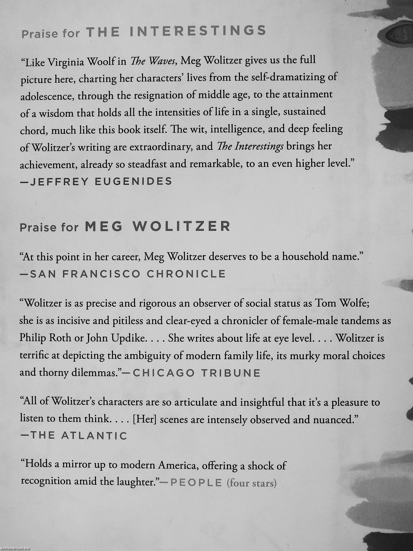 "Like Virginia Woolf in The Waves, Meg Wolitzer gives us the full picture here, charting her characters' lives from the self-dramatizing of adolescence, through the resignation of middle age, to the attainment of a wisdom that holds all the intensities of life in a single, sustained chord, much like this book itself. The wit, intelligence, and deep feeling of Wolitzer's writing are extraordinary, and The Interestings brings her achievement, already so steadfast and remarkable, to an even higher level." -JEFFREY EUGENIDES