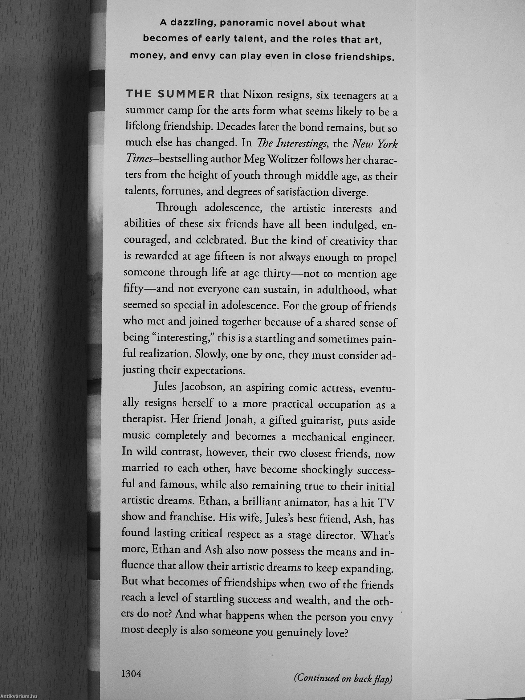 THE SUMMER that Nixon resigns, six teenagers at a summer camp for the arts form what seems likely to be a lifelong friendship. Decades later the bond remains, but so much else has changed. In The Interesting!, the New York Tiwzfi-bestselling author Meg Wolitzer follows her characters from the height of youth through middle age, as their talents, fortunes, and degrees of satisfaction diverge.