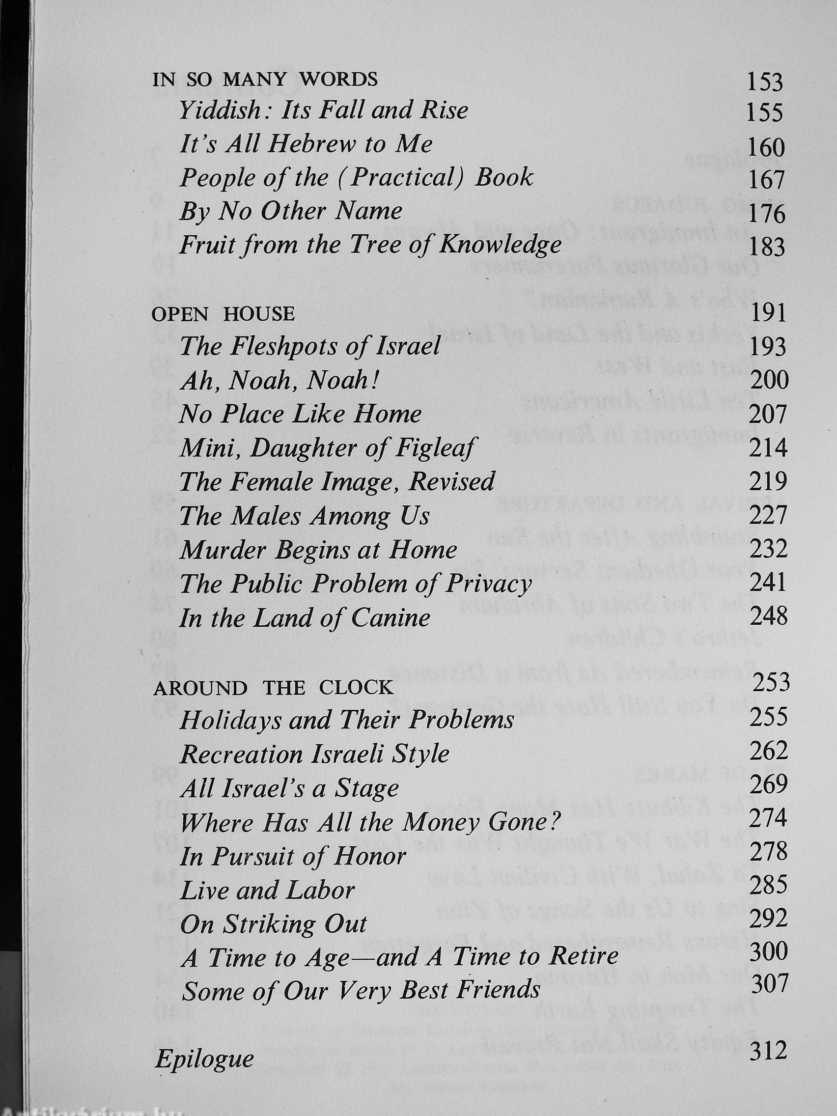 What the Israelis work at, how they relax, what they eat and wear, their generation gap, their ambitions and frustrations, their cultural pursuits—all these and much more are held up to the light, studied and described with painful honesty. This is a work devoid of embellishment. It is written by an Israeli about her fellow citizens, with love, with humor, with biting sarcasm, with revealing insight.