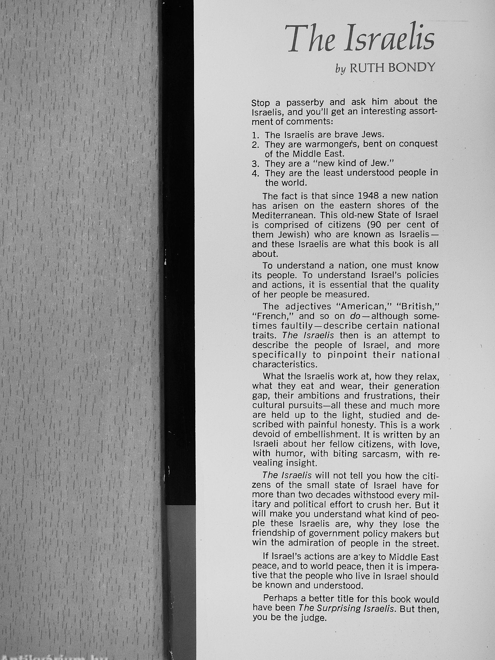 The Israelis will not tell you how the citizens of the small state of Israel have for more than two decades withstood every military and political effort to crush her. But it will make you understand what kind of people these Israelis are, why they lose the friendship of government policy makers but win the admiration of people in the street.