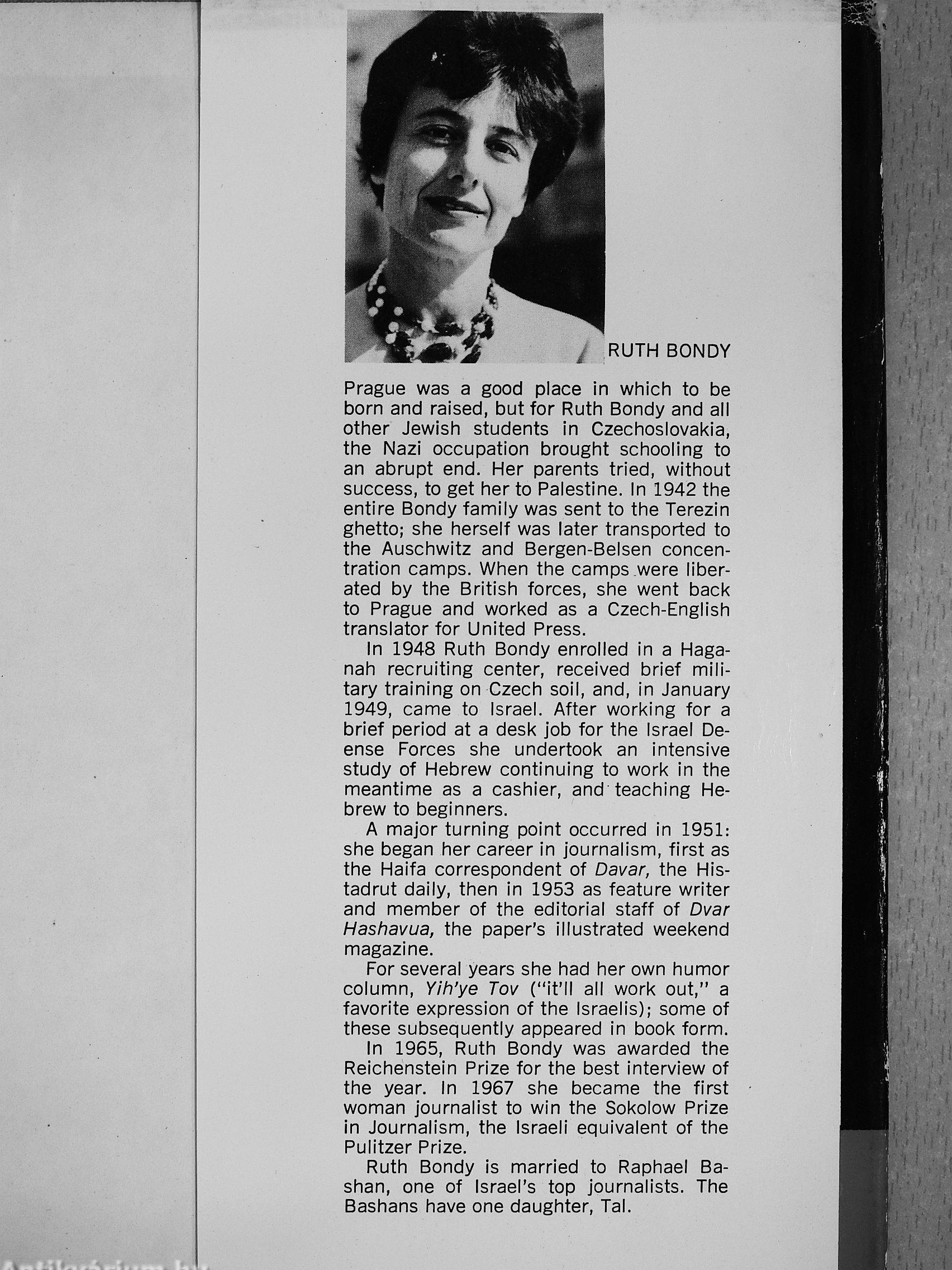 In 1948 Ruth Bondy enrolled in a Haga-nah recruiting center, received brief military training on Czech soil, and, in January 1949, came to Israel. After working for a brief period at a desk job for the Israel De-ense Forces she undertook an intensive study of Hebrew continuing to work in the meantime as a cashier, and teaching Hebrew to beginners.