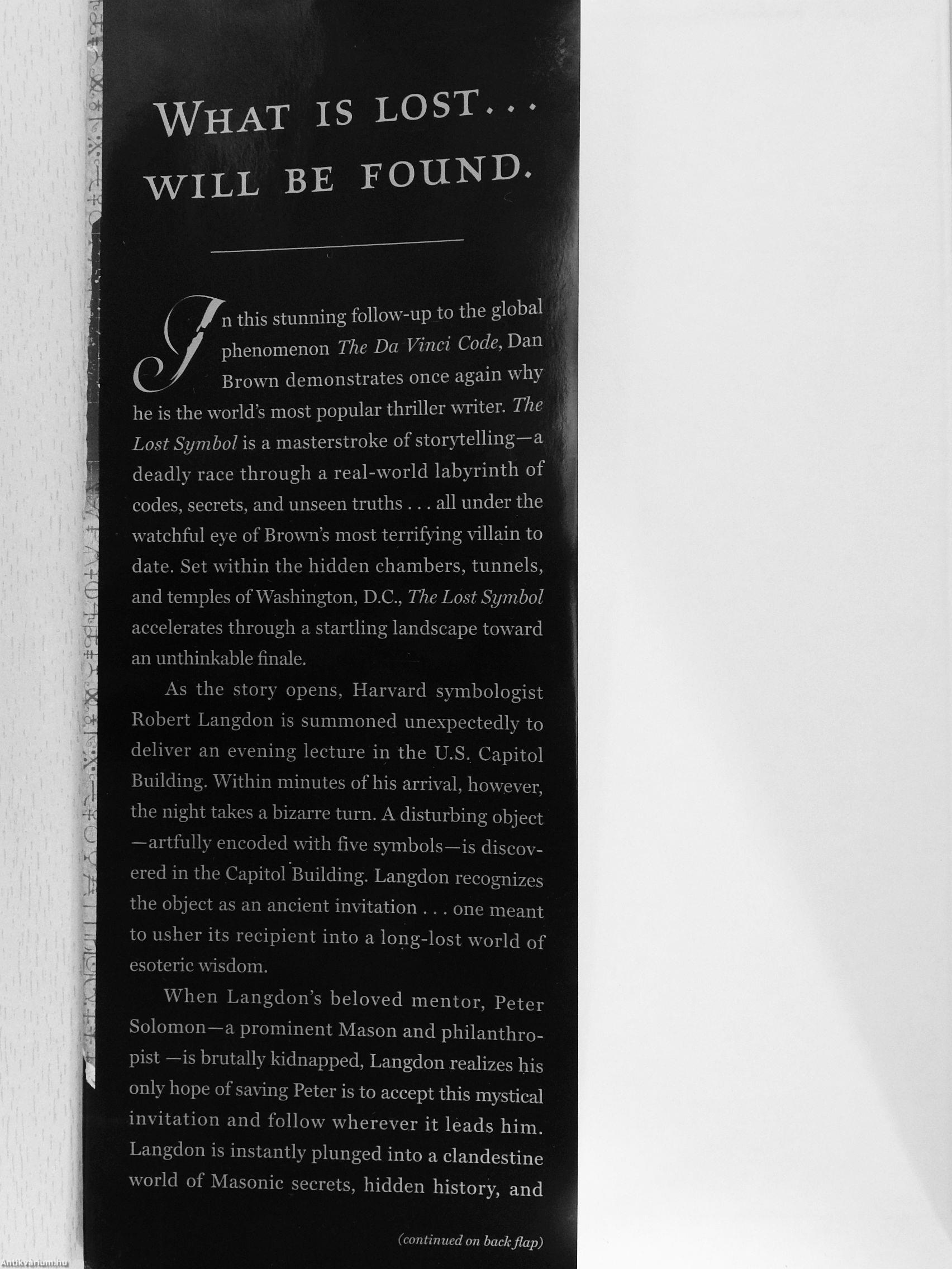As the world discovered in The Da Vinci Code ^xid Angels ^ Demons, Dan Brown's novels are brilliant tapestries of veiled histories, arcane symbols, and enigmatic codes. In this new novel, he again challenges readers with an intelligent, lightning-paced story that offers surprises at every turn. The Lost Symbol is exactly what Brown's fans have been waiting for . . . his most thrilling novel yet.