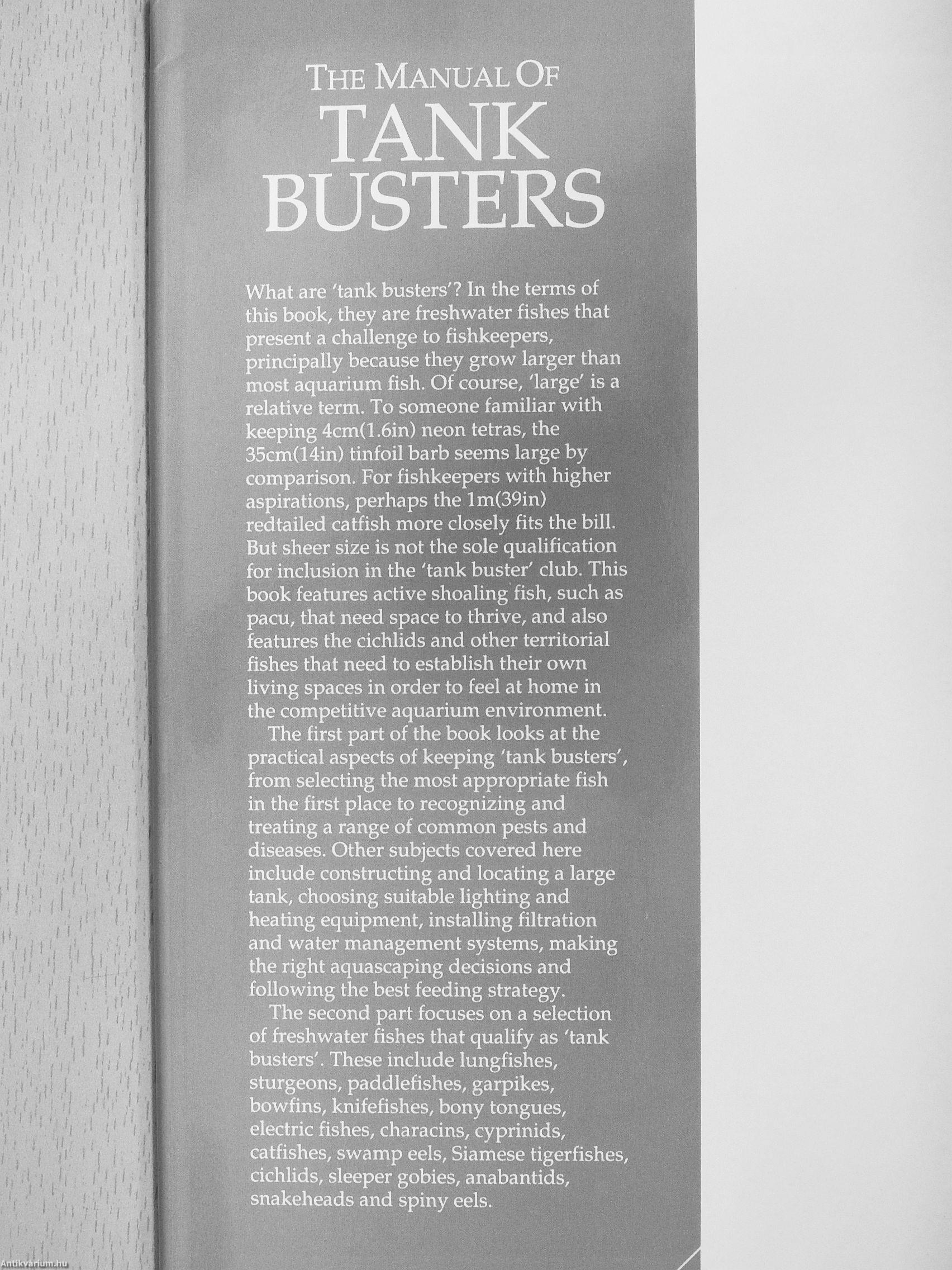 The first part of the book looks at the practical aspects of keeping 'tank busters', from selecting the most appropriate fish in the first place to recognizing and treating a range of common pests and diseases. Other subjects covered here include constructing and locating a large tank, choosing suitable lighting and heating equipment, installing filtration and water management systems, making the right aquascaping decisions and following the best feeding strategy.