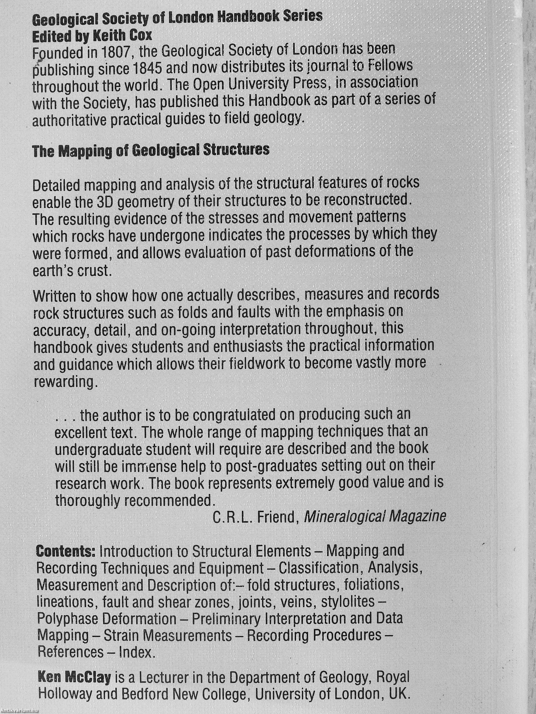 F;)unded in 1807, the Geological Society of London has been publishing since 1845 and now distributes its journal to Fellows throughout the world. The Open University Press, in association with the Society, has published this Handbook as part of a series of authoritative practical guides to field geology.