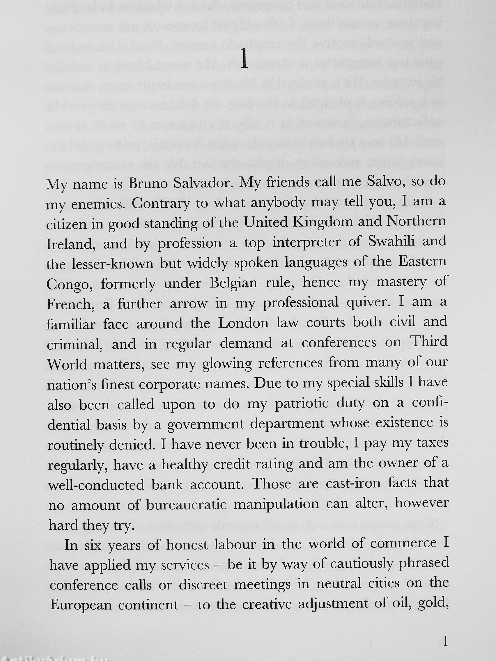 Bruno Salvador, known to friends and enemies alike as Salvo, is Che ever-innocent, cwenty-nine-year-old orphaned love-child of a Catholic Irish missionary and a Congolese headman's daughter. Educated first ac mission school in che Ease Congolese province of Kivu, and lacer ac a discreec sanctuary for che secrec sons of Rome, Salvo is inspired by his mentor Brocher Michael to crain as a professional incerprecer in che minoricy African languages of which, almosc from birth, he has been an obsessive colleccor