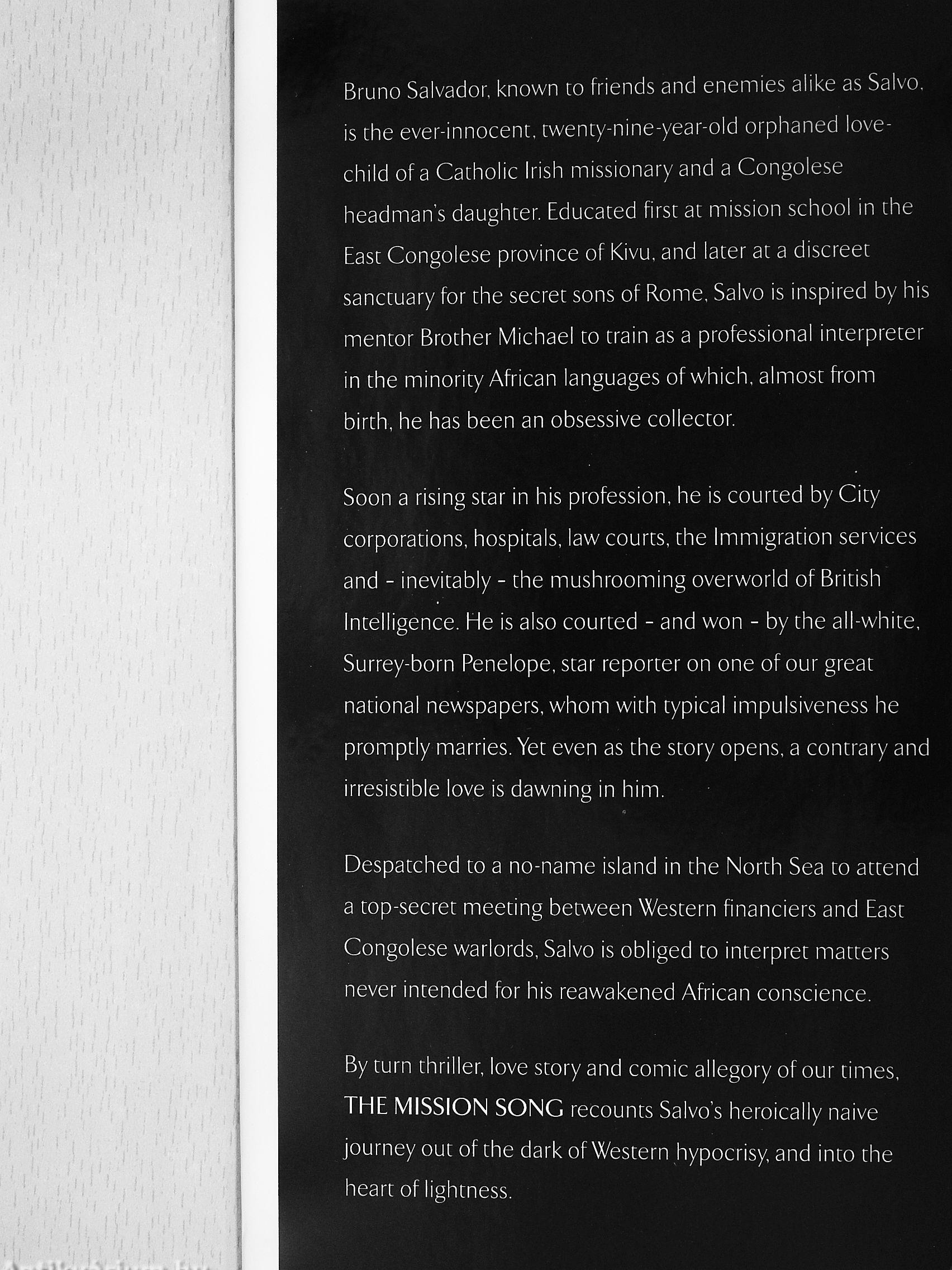 By curn thriller, love story and comic allegory of our times, THE MISSION SONG recounts Salvo's heroically naive journey out of the dark of Wescern hypocrisy, and inco che hearc oflighcness. Vissza