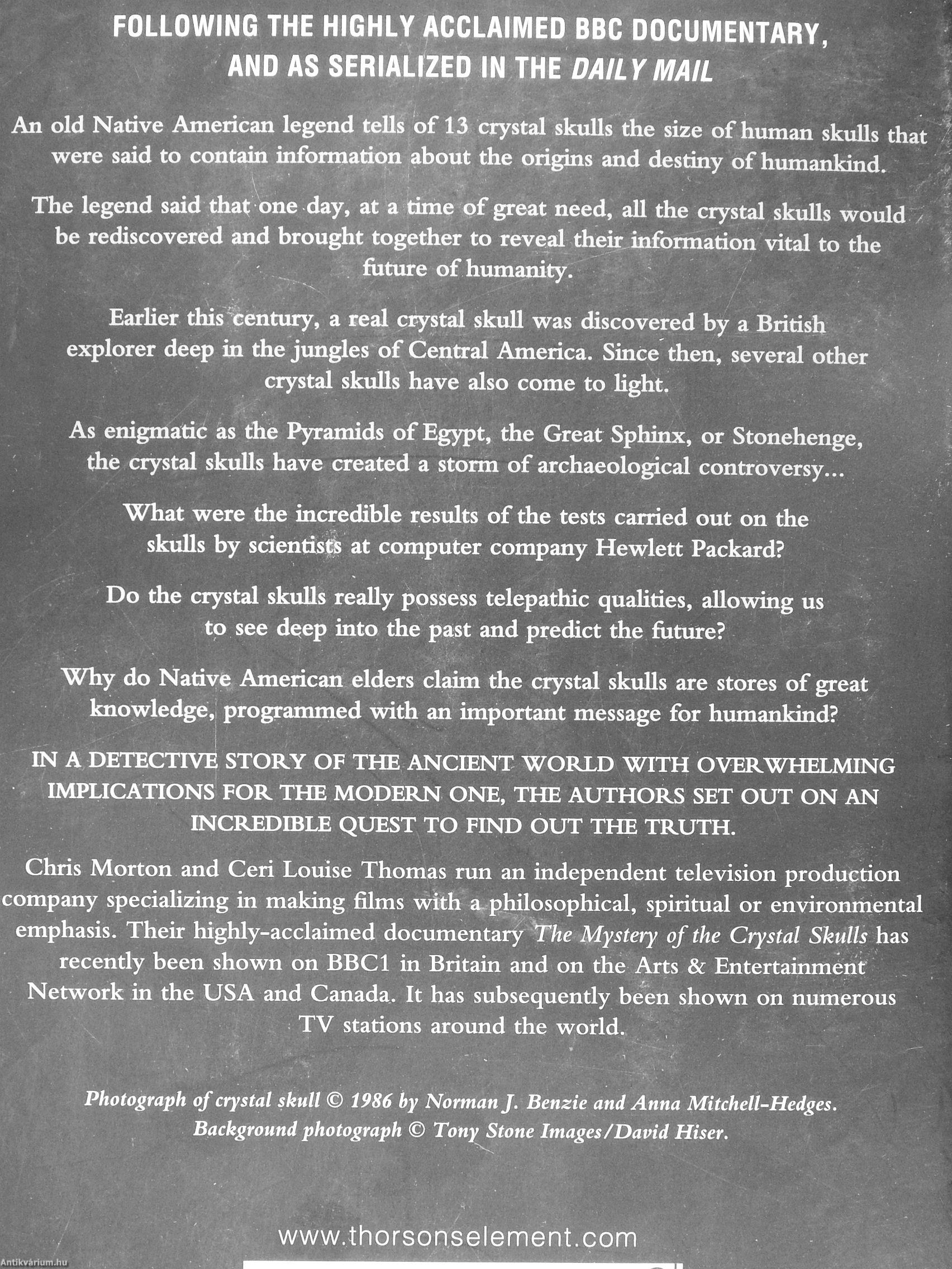 Chris Morton and Ceri Louise Thomas run an independent television production company specializing in making films with a philosophical, spiritual or environmental emphasis. Their highly-acclaimed documentary The Mystery of the Crystal Skulls has recently been shown on BBCl in Britain and on the Arts & Entertainment Network in the USA and Canada. It has subsequently been shown on numerous TV stations around the world.