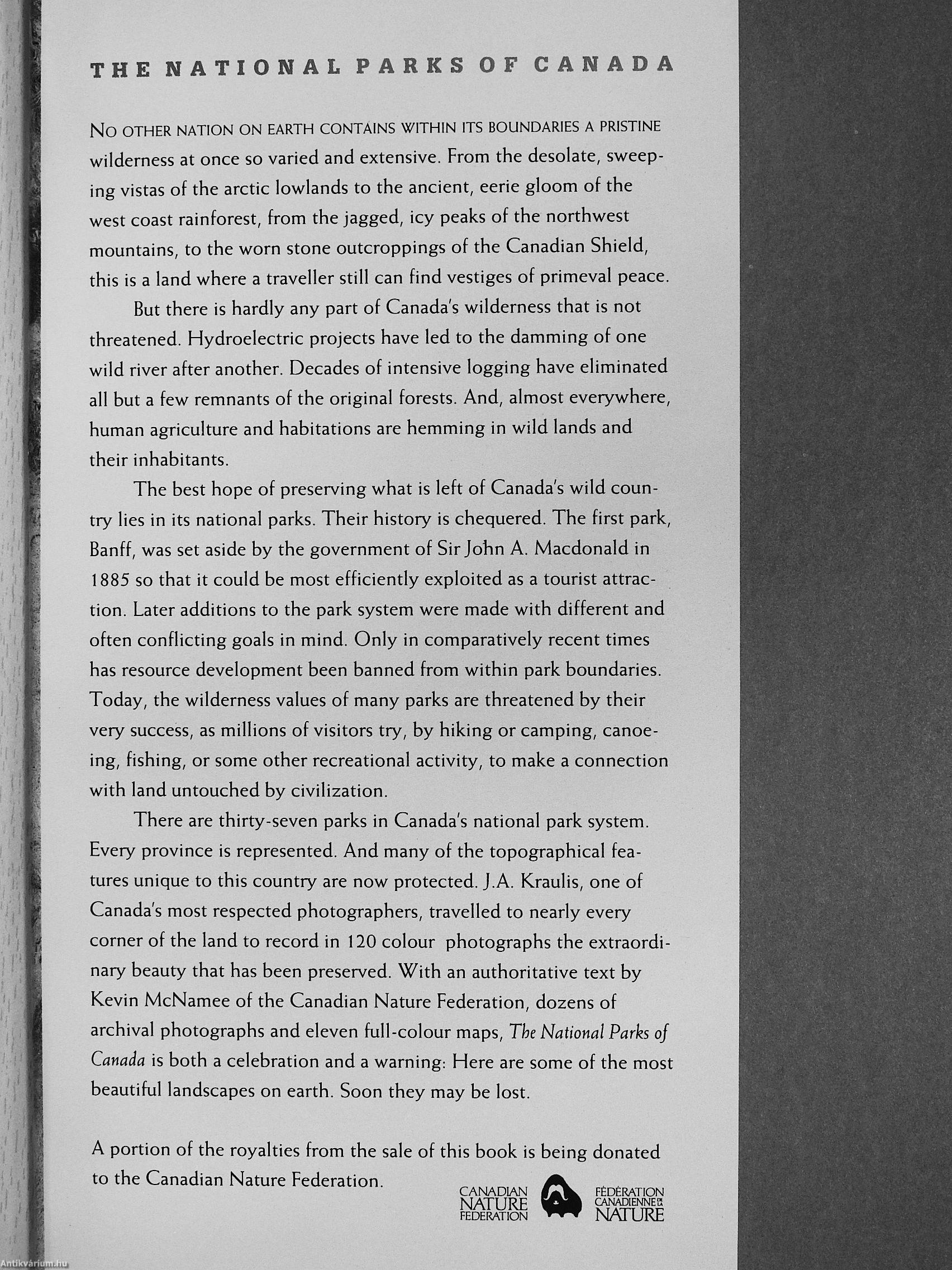 There are thirty-seven parks in Canada's national park system. Every province is represented. And many of the topographical features unique to this country are now protected. j.A. Kraulis, one of Canada's most respected photographers, travelled to nearly every corner of the land to record in 120 colour photographs the extraordinary beauty that has been preserved. With an authoritative text by Kevin McNamee of the Canadian Nature Federation, dozens of archival photographs and eleven hill-colour maps. The National Parks of Canada is both a celebration and a warning: Here are some of the most beautiful landscapes on earth. Soon they may be lost.